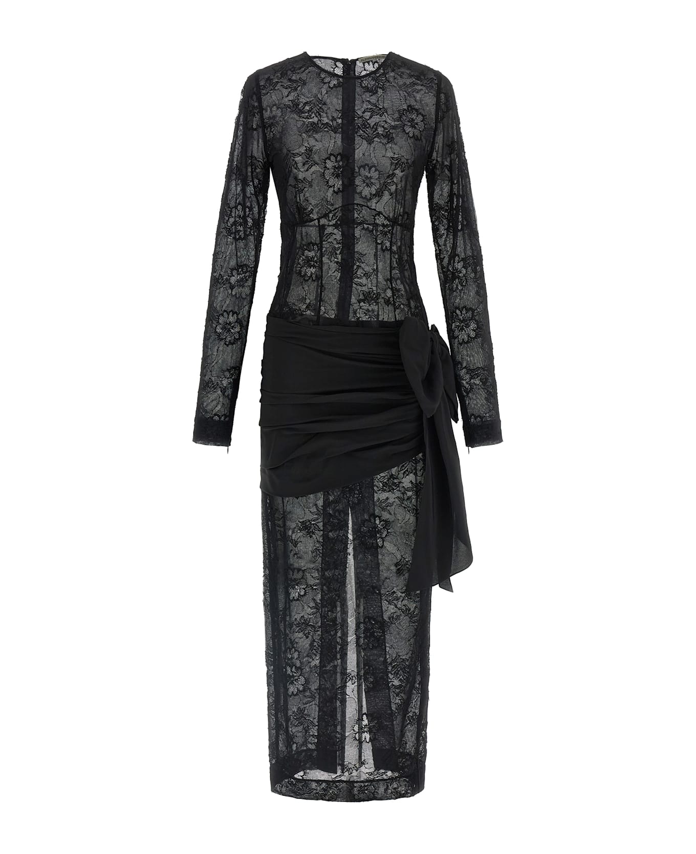 Long semi-transparent lace dress, tone-on-tone silk insert at the waist with curls, draping and maxi bow, round neckline, long sleeves with zip on the hem, zip closure and wide back split.