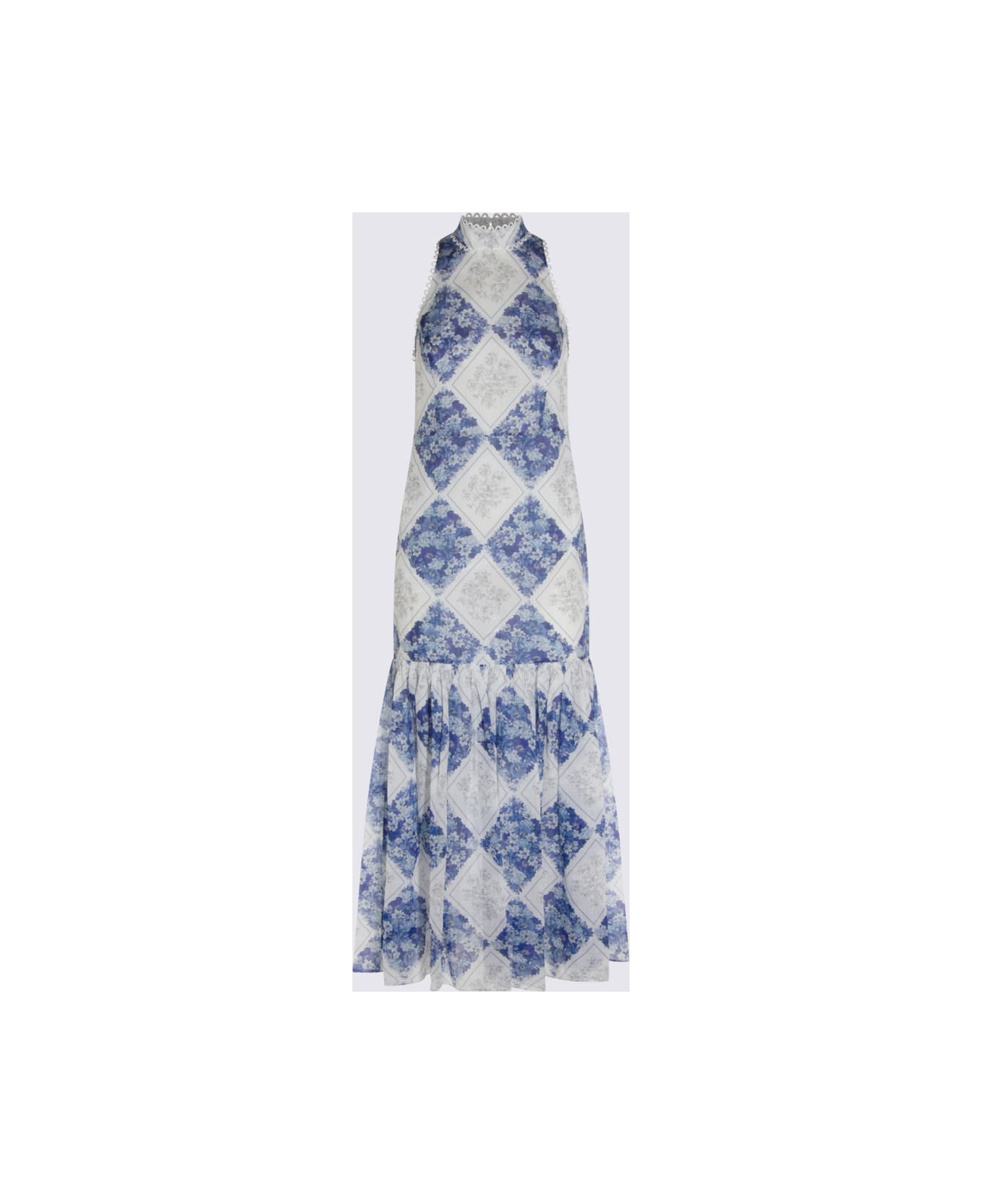 Light blue and white maxi dress from Twinset featuring maxi length, sleeveless, print and back zip fastening. Composition: 100% Ramie