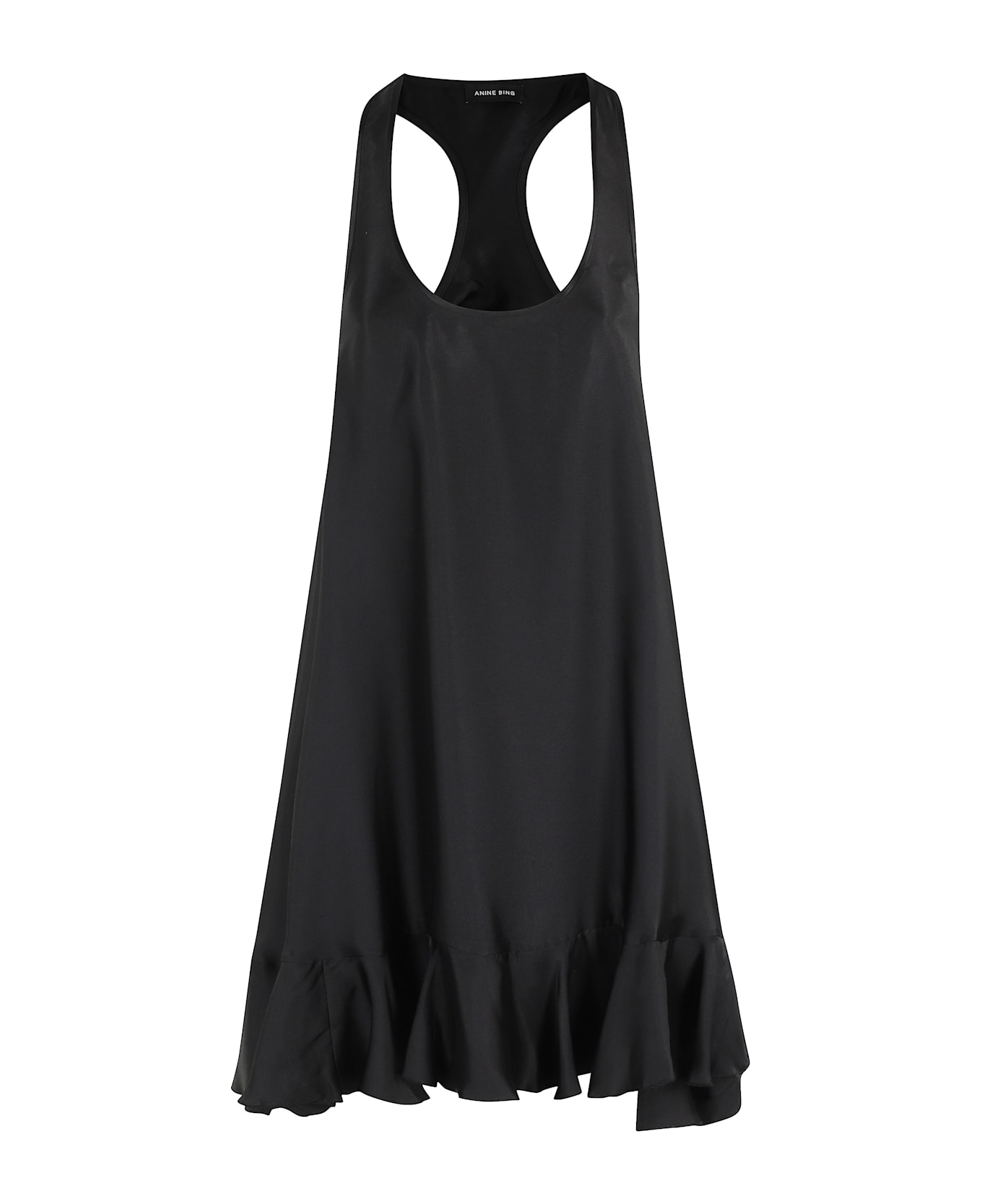 Lilith dress - Anine Bing - black color - trapeze silhouette - double-face silk charmeuse blend - Olympic neckline - ruffle hemline - knee length - flowing fit