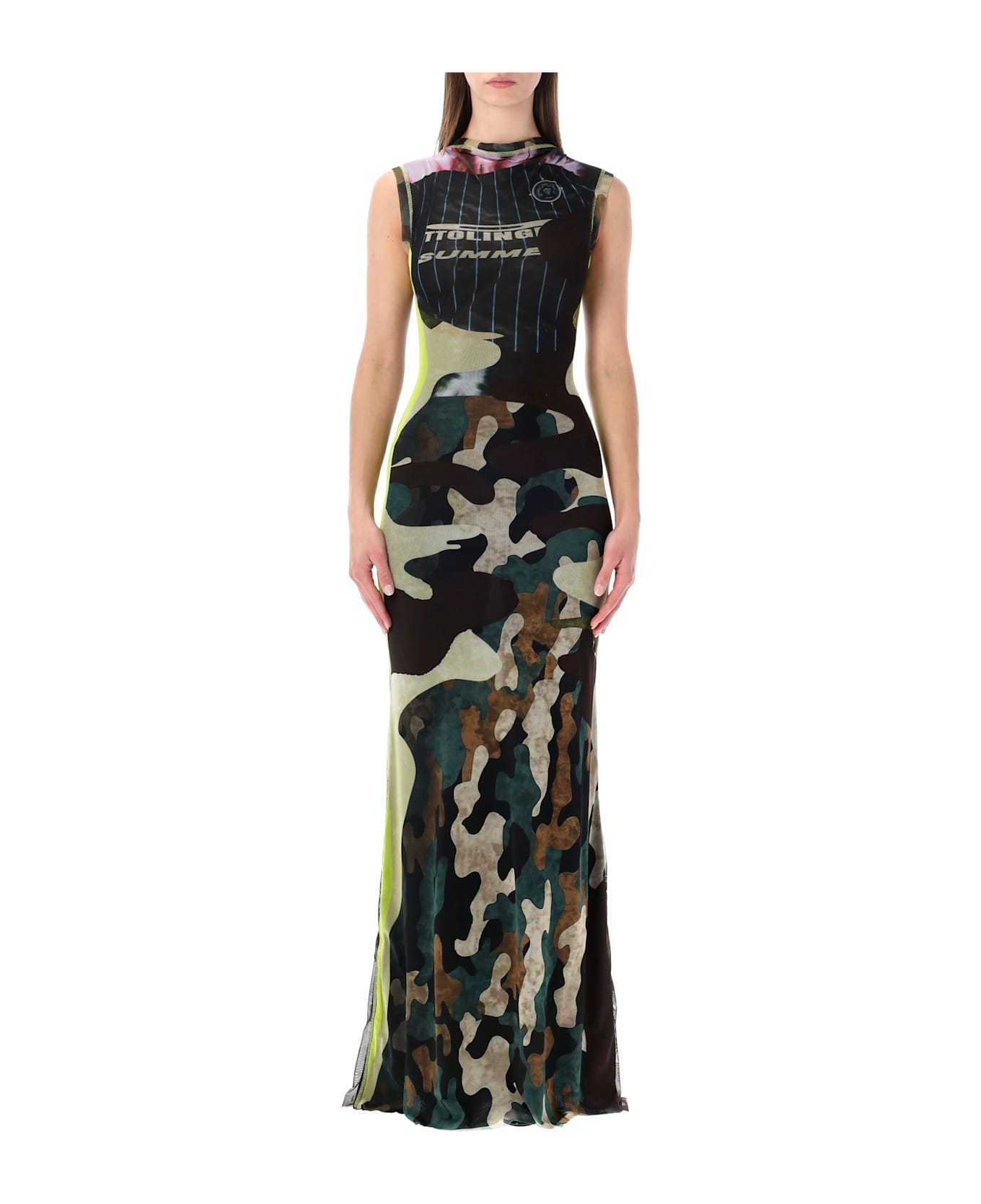 The Ottolinger Camou Mesh Long Dress Channels The Brand s Experimental Spirit Through A Layered Camouflage Print Enhanced By Semi-sheer Mesh. Its Long, Body-skimming Silhouette Creates A Striking Shape, While Graphic Contrasts And Athletic-inspired Details Highlight The Label s Signature Aesthetic. A Bold, Contemporary Piece That Merges Sensuality With Visual Impact. Semi-sheer Mesh Long Dress Multicolor Camouflage Print Body-hugging Fit Rounded Neckline Graphic Contrast Accents Alessandra Is 1,75 M And Wears Size S