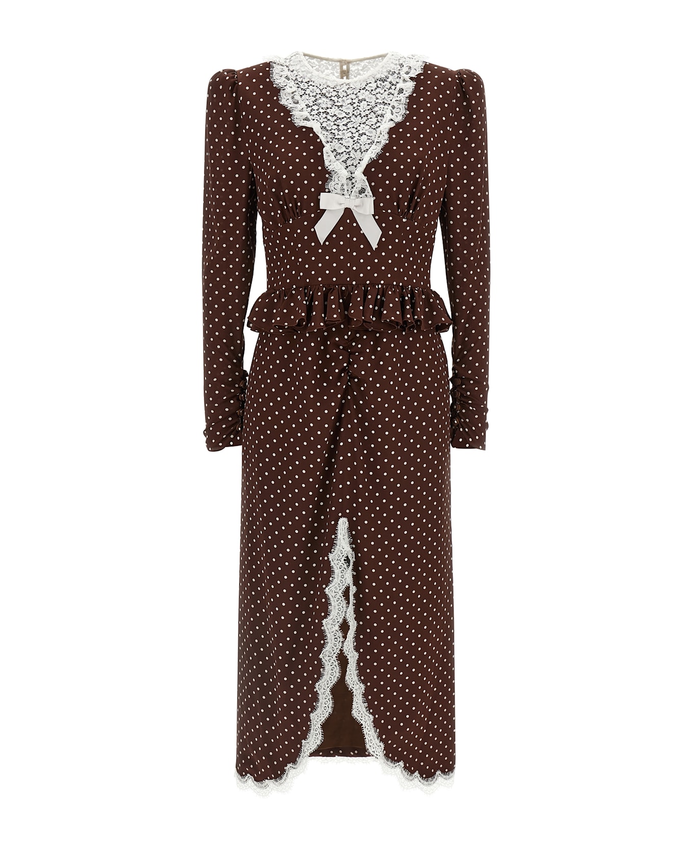 Polka Dot Midi' polka dot silk dress with lace inserts, crew neck, ruffles and curling on the waistband, asymmetrical hem with wide front split, long sleeves with buttons and curls on the sleeve hem, back zip closure.
