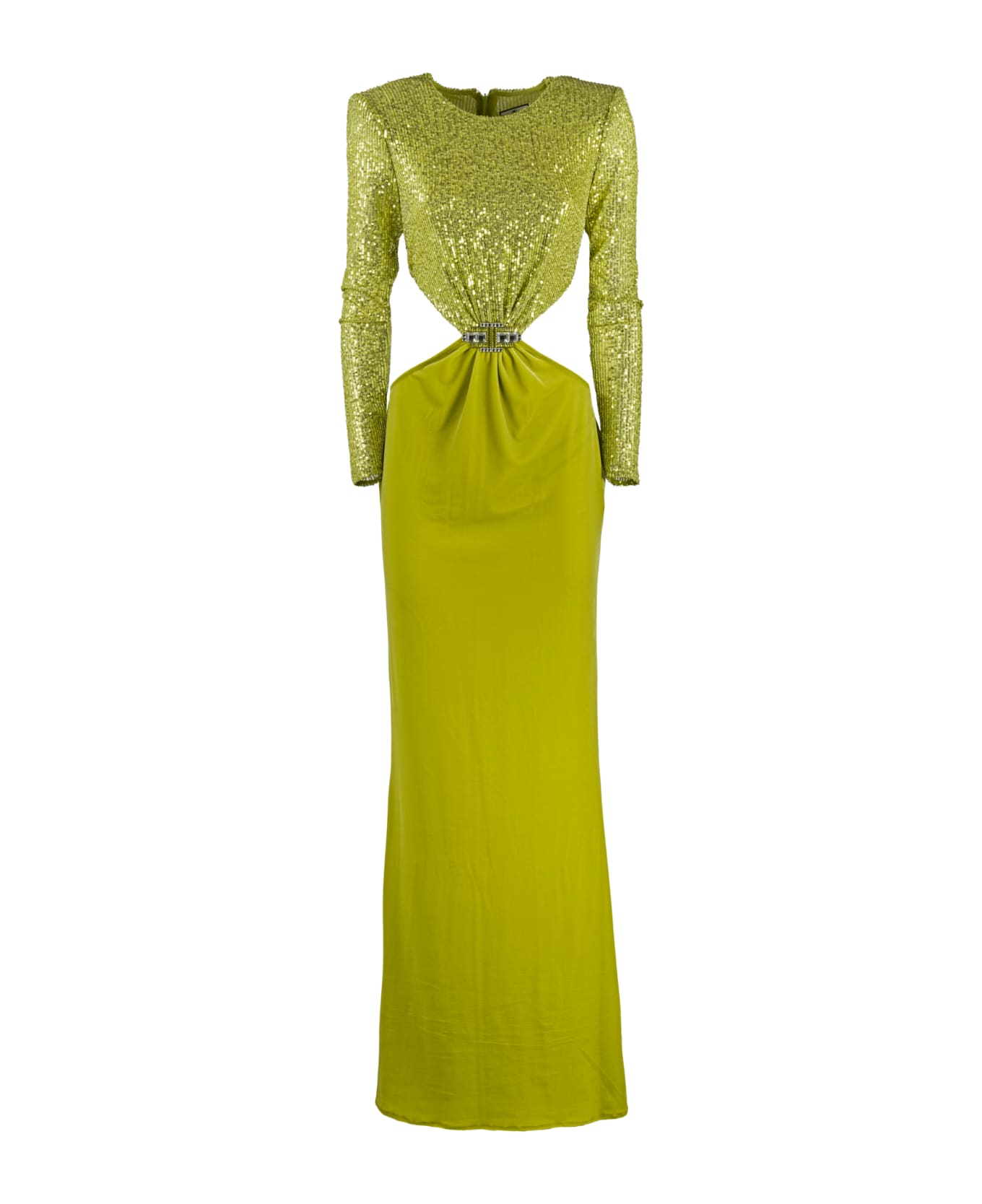 Elisabetta Franchi red carpet dress in sequins and velvet. Mermaid line. The waist is emphasized by a rhinestone accessory that closes the cut on the hips. Jersey lining. Padded shoulder straps. Invisible zip on the back. Rhinestone accessory. Composition: 90% Polyester 10% Elastane. Made in Italy.