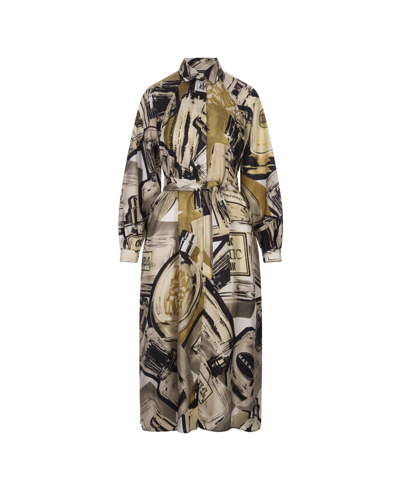 Long shirt dress, Rimmel model by Max Mara made of precious pure silk twill with all-over contrast print, a feminine silhouette with flared skirt, wide raglan sleeves with cuffs and shirt collar. Unlined model, finished with piping details and matching belt to tie at the waist. Concealed front fastening.