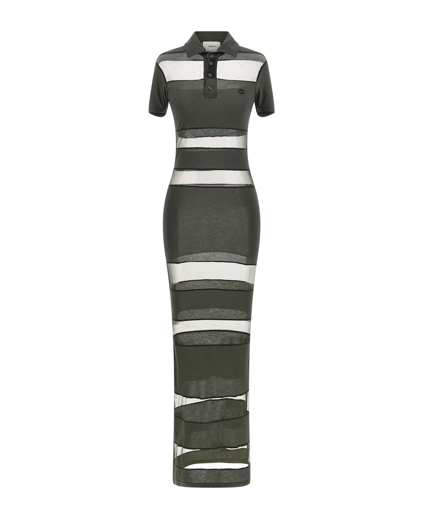 Long 'Striped Sheer Polo' dress in stretch technical fabric with alternating opaque and transparent stripes, tone-on-tone logo embroidery on the front, collar and buttons, short sleeves, side split.