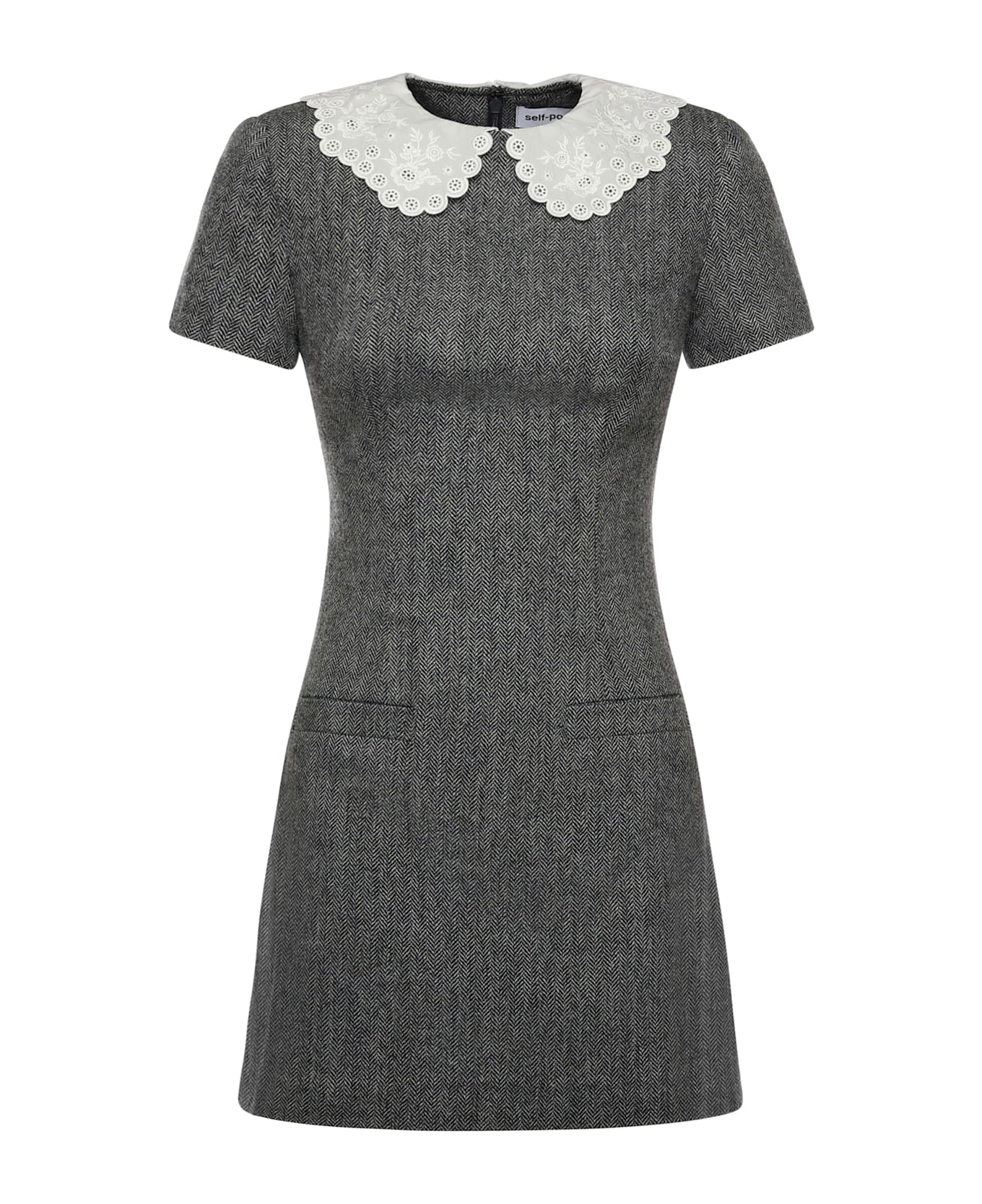 -Made of herringbone wool knit -Contrasting lace collar -Short sleeves -Hidden back zip closure -The size shown in the photo is 6 -Color: Gray