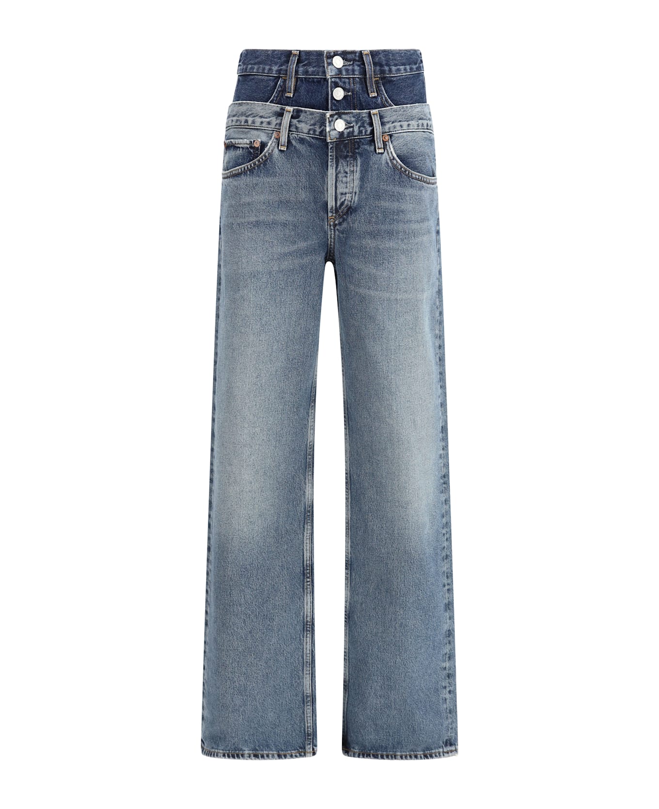 The elson jeans by agolde features a relaxed straight-leg silhouette crafted from double-waisted dark and medium indigo denim. made from rigid, non-stretch regenerative cotton, it delivers a structured yet comfortable feel. subtle fading, marbling, and whiskering details give it a naturally worn-in character. a versatile piece, ideal for pairing with fitted tops or layered knits for a balanced and effortless look.
