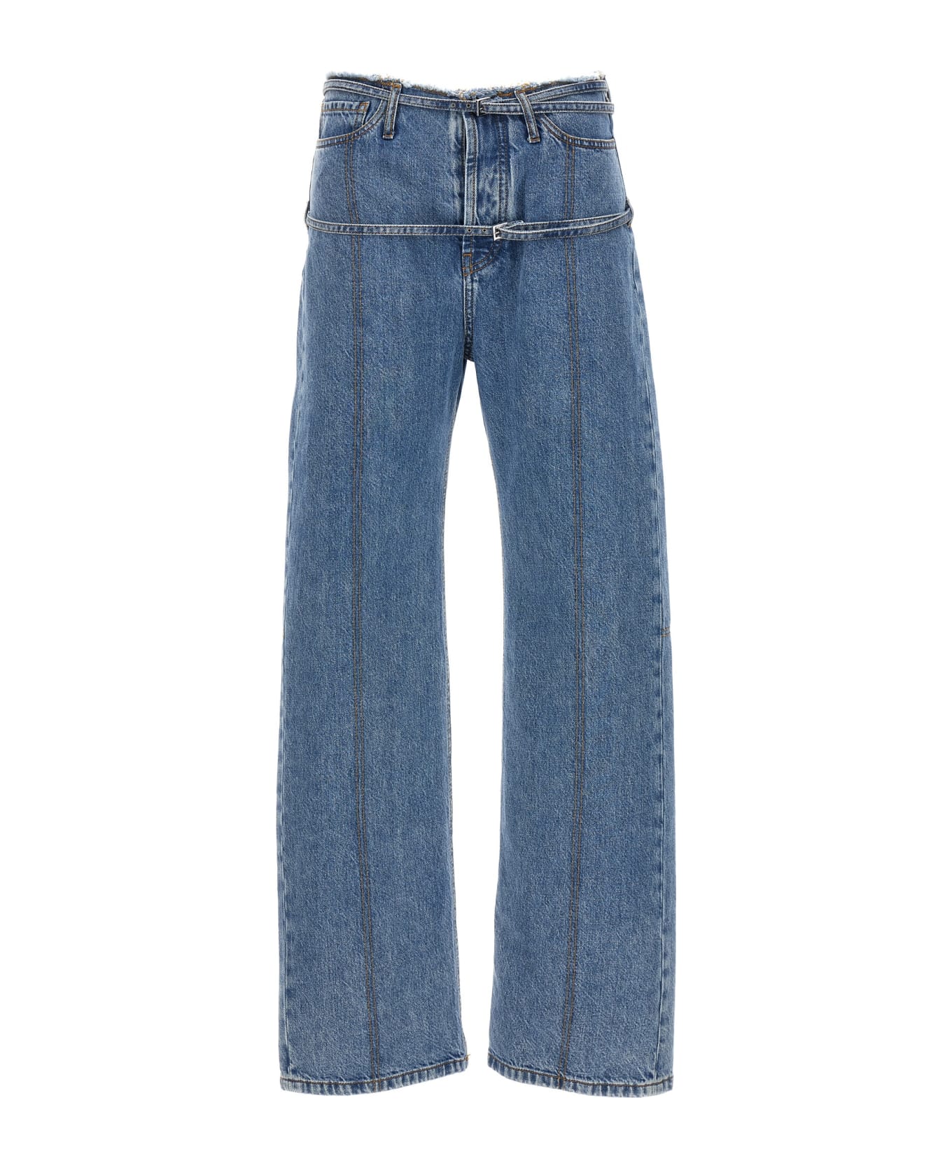 'Le de Nîmes Caraco' low-waisted cotton denim jeans with wide leg, frayed waist, zip and button closure, strap detail.