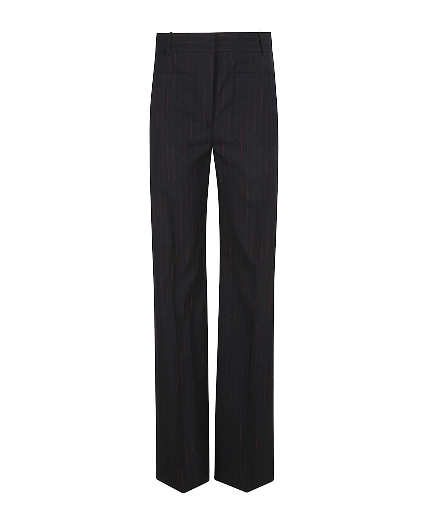Alina trousers in a flowing wool blend from VICTORIA BECKHAM. High-rise; concealed hook and zip fastening; belt loops. Curved waist design flows into a flattering wide leg. Features a navy and pink pinstripe design and patch pockets to the front and back.