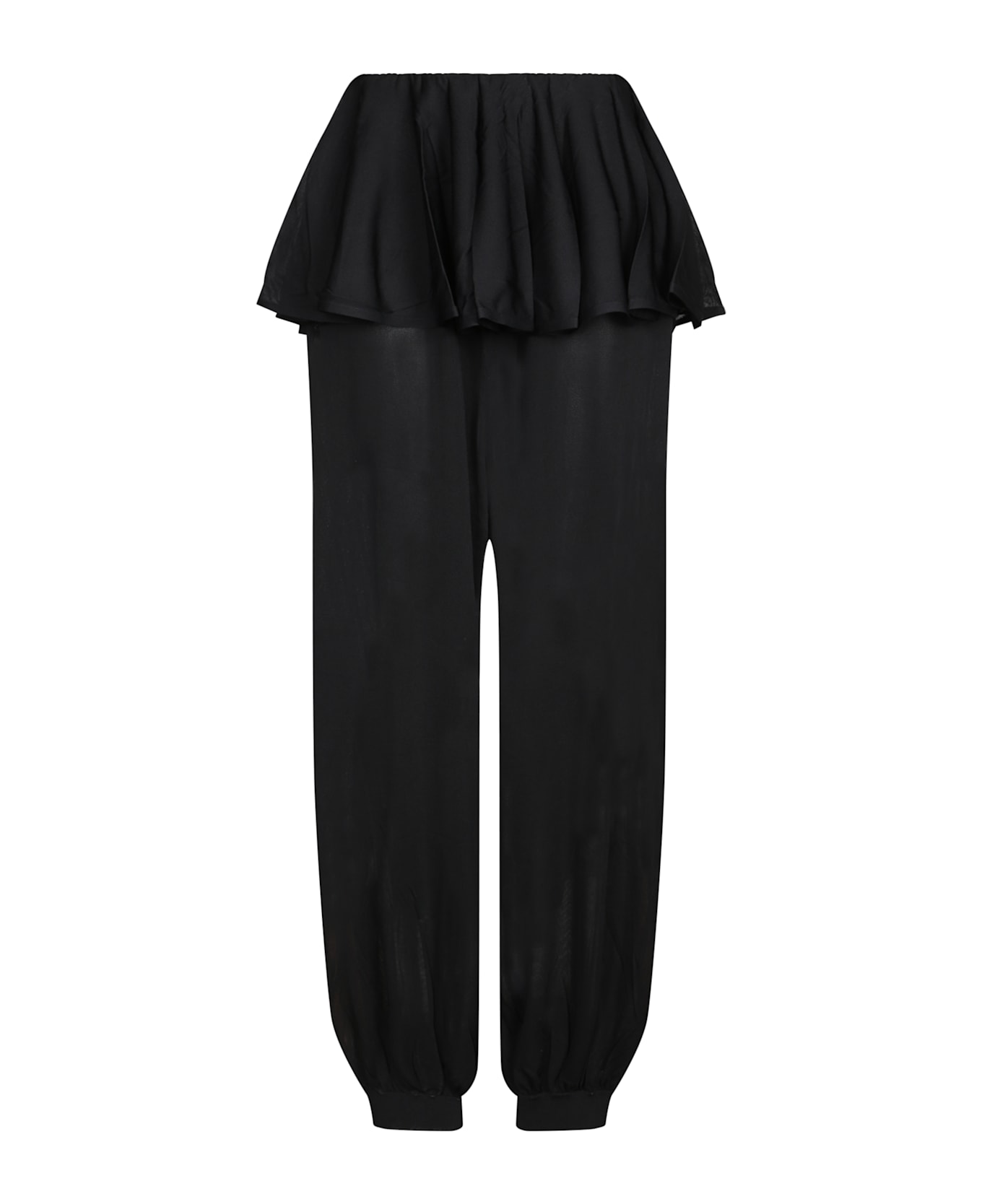 These elegant trousers from Alaia showcase a unique silhouette with their draped ruffle overlay, adding a theatrical flair. The versatile black semi-sheer design makes this piece a must-have for exclusive evenings.