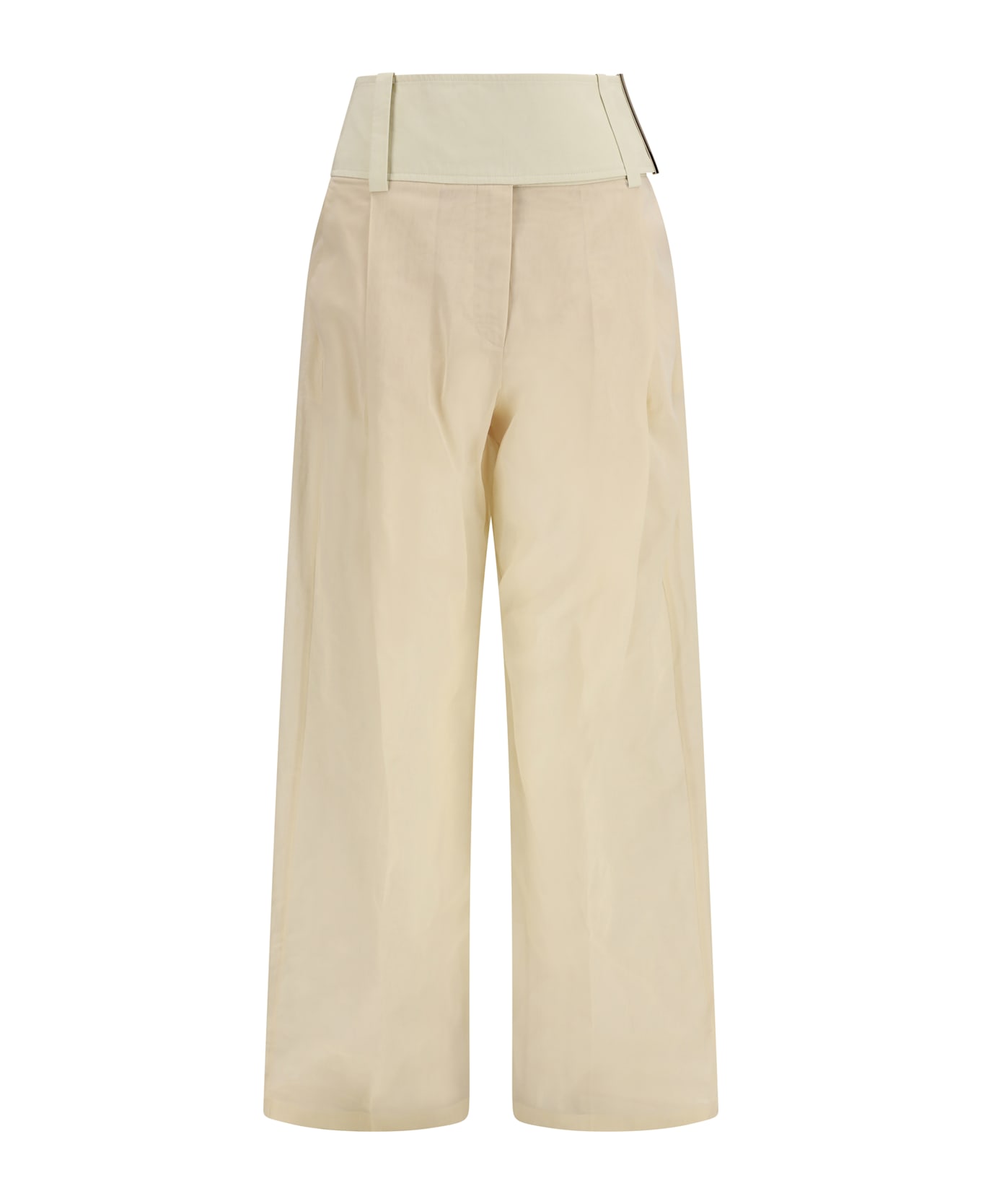 The ferito pants by max mara sportmax stand out for a wide-leg line that enhances the silhouette with lightness. crafted from organza voile in pure cotton, they feature a low rise with a cotton poplin belt enriched by a metal detail. the crease along the leg adds volume and defines the structure, while side pockets and welt back pockets complete the design.