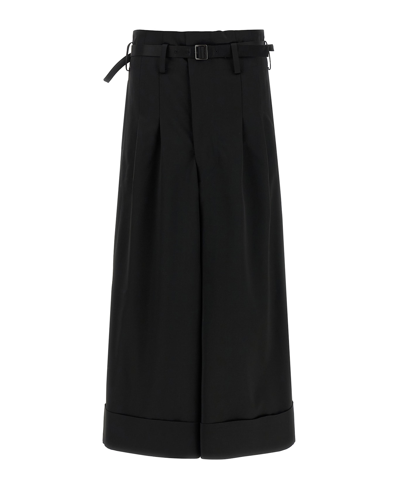 Shiny satin-effect wool blend pants, high waist with bag construction, crop model, low crotch, wide flared leg, pins, front zip and hook closure, pockets, turn-up on the leg bottom, removable matching belt.