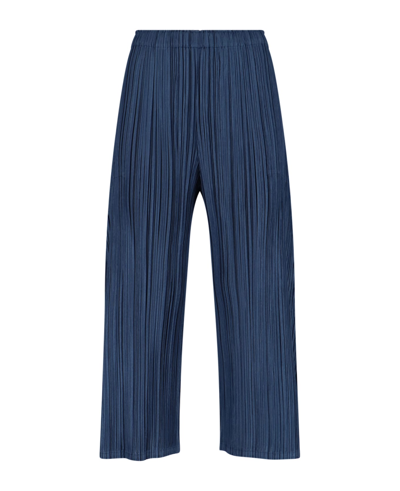 Pleats Please Plissé wide pants in blue fabric with pleated pattern, medium elastic waistband, two side pockets, split detail on the leg, straight leg. Composition: 100% Polyester