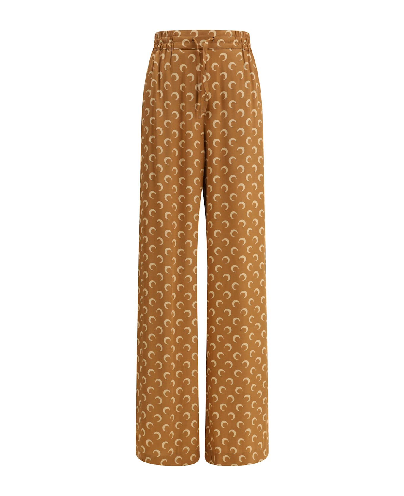 Marine serre's satin moon pants combine comfort and style with an elastic waistband that can be adjusted via drawstring and a fluidly cut wide leg. two side welt pockets add functionality, while the iconic moon pattern decorates the garment with elegance and recognition. a contemporary must-have with a polished and sophisticated finish.