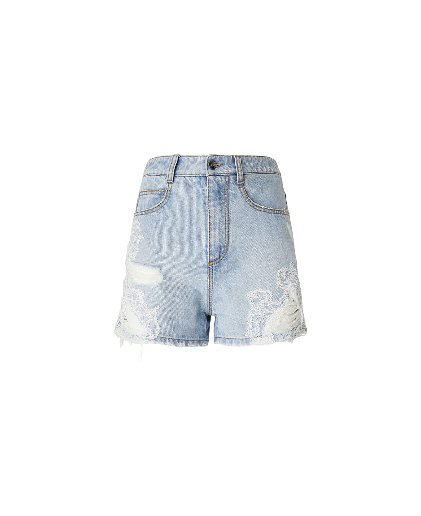Bermuda shorts by Ermanno Scervino in light-wash blue firm denim decorated with rips and abrasions, near which precious embroidered lace inserts have been applied. The model features a five-pocket design, a waistband with tonal loops, a front zip and metal button fastening, and a back leather flap with the brand's logo.