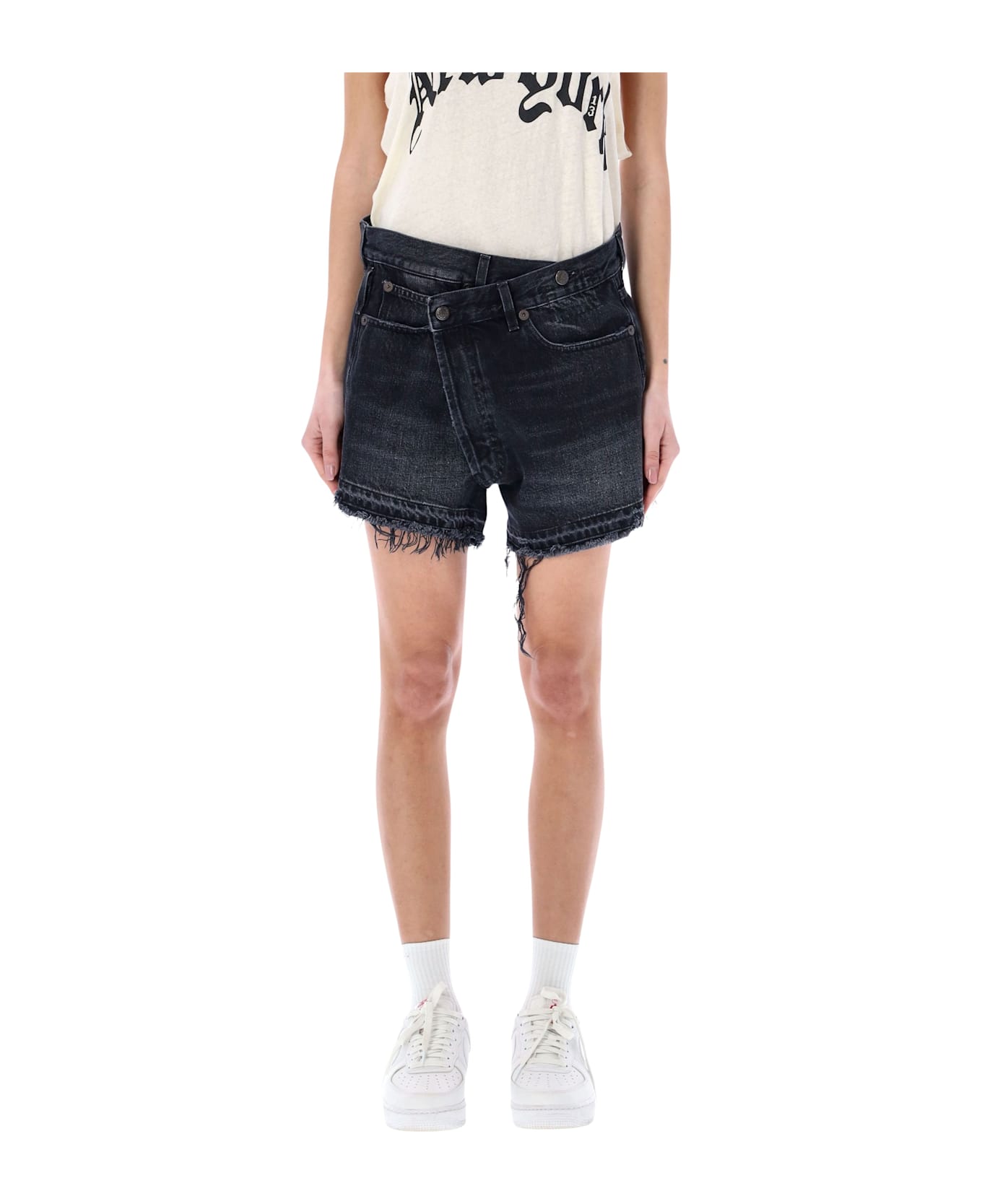 These Crossover Denim Shorts By R13 Reinterpret A Classic Silhouette With A Rebellious, Contemporary Edge. Defined By An Asymmetric Button Fastening, They Feature A Lived-in Distressed Finish That Enhances Their Effortless Attitude. The Frayed Hem And Five-pocket Construction Complete A Bold, Casual Design Rooted In The Brand s Signature Aesthetic. Denim Construction