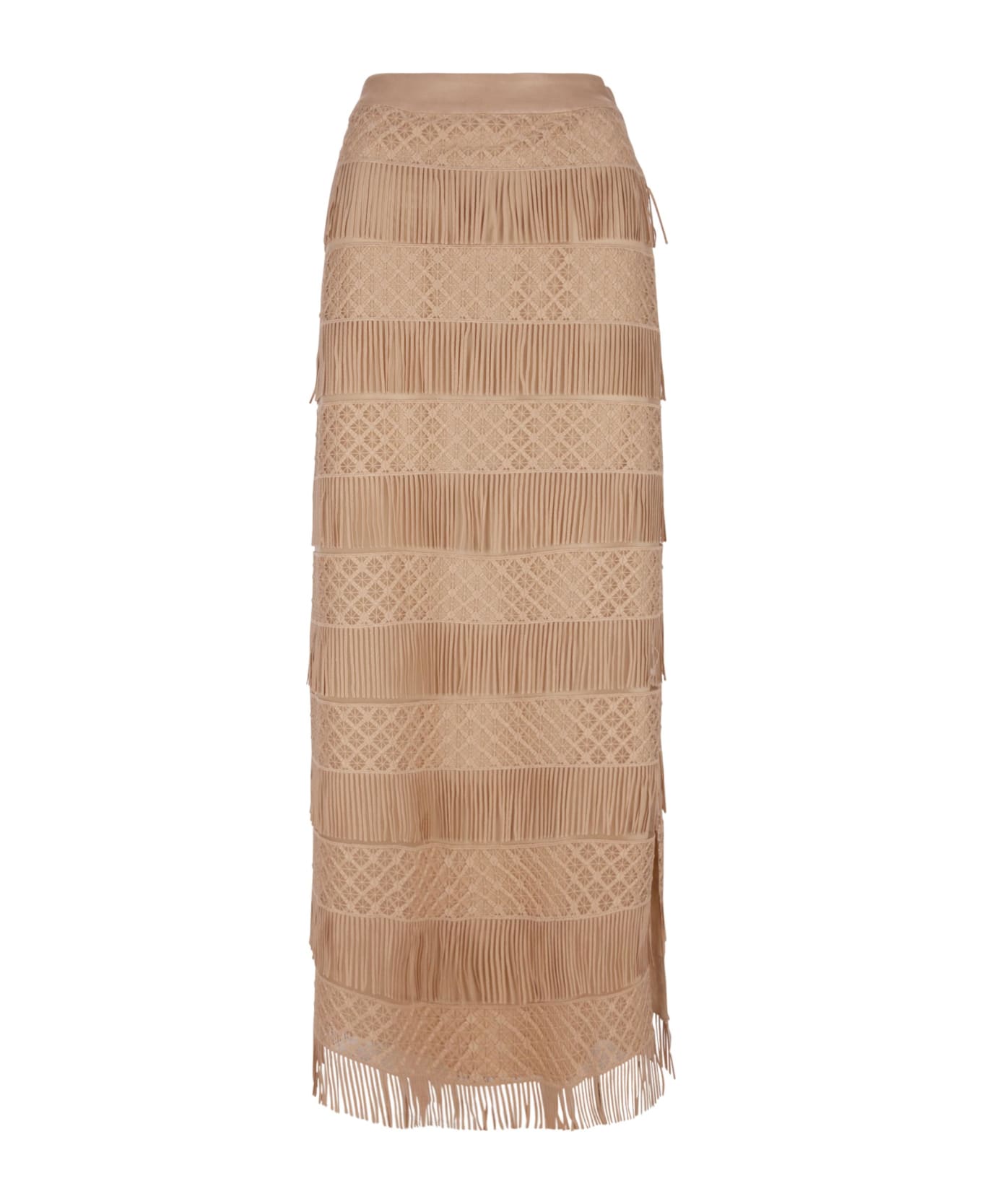 High waist beige skirt in polyester, side zip closure, macramé embroidery, fringes 100% Polyester Item in photo corresponds to a 40 IT size Mannequin size: 42 IT Mannequin measures: Height 199cm, Bust/Breast 85cm, Waist 69cm, Hips 90cm, Shoulder 40cm, Neck 33. 5cm