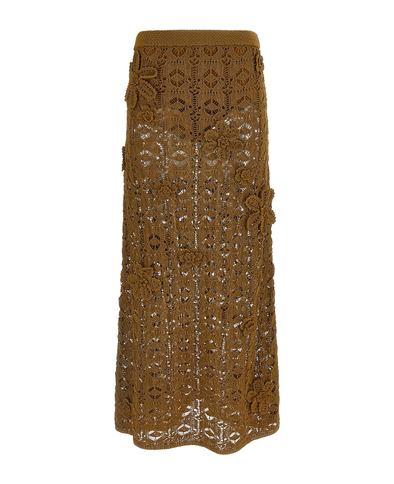 Anthemis' crochet cotton midi skirt with 3D tone-on-tone floral appliqués on the front, flared silhouette, elastic waistband, removable matching high waist briefs.