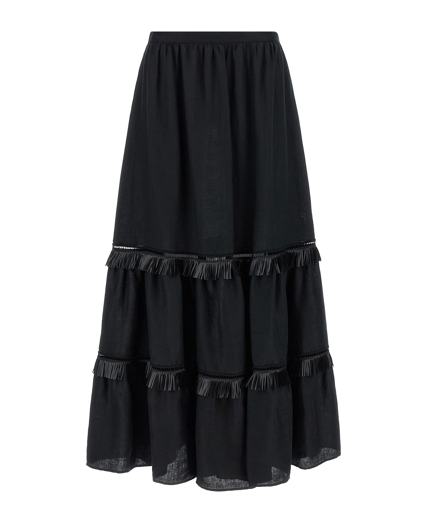 Long full skirt, waist belt with concealed side zip, curling with 'au jour' inserts and fringed insert. Composition: 100% linen