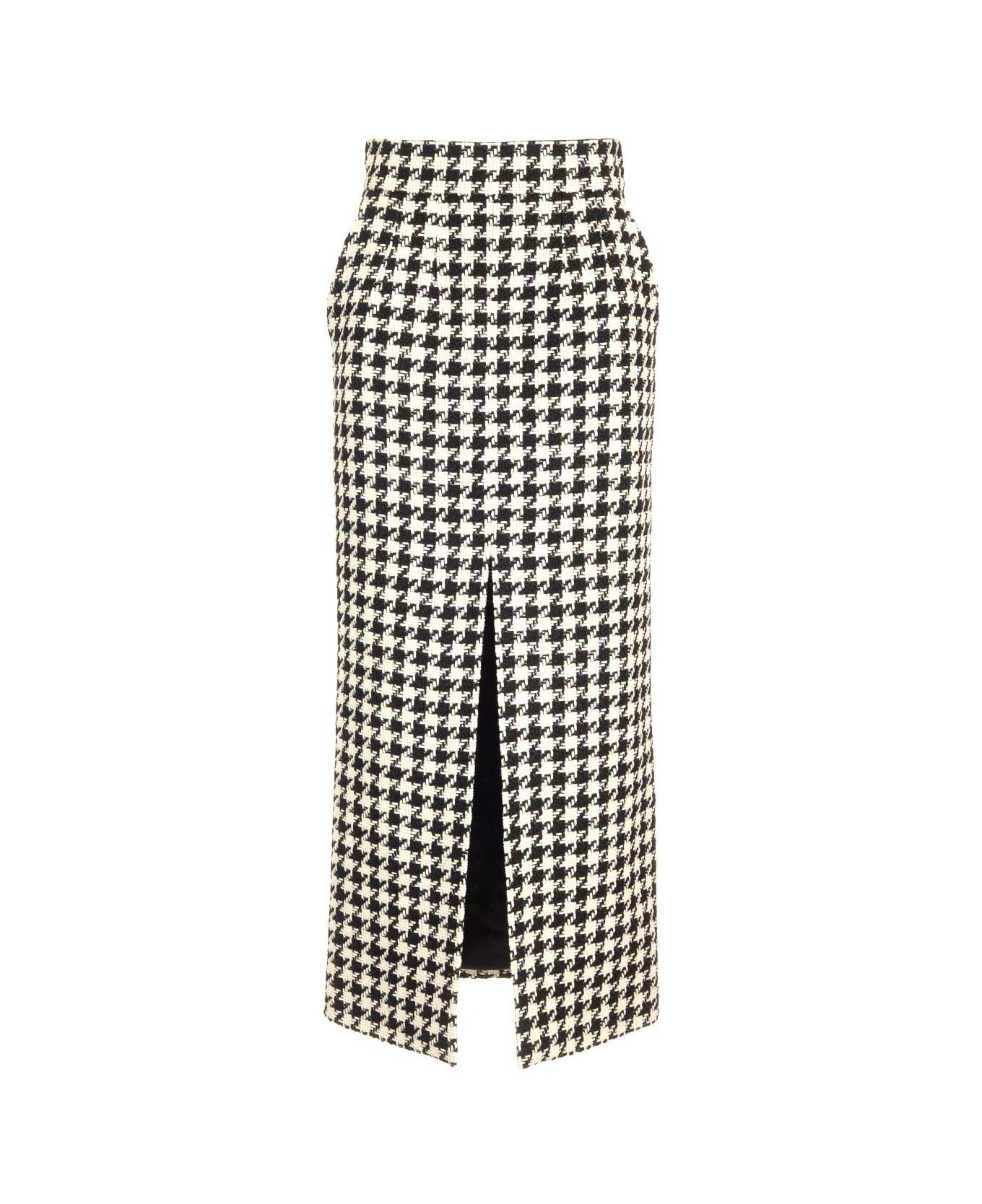 Stretch cotton and wool fabric midi skirt from Dolce & Gabbana with houndstooth pattern, high waist, back zip, front slit. Composition: 35%CO+65%WV 08%EA+92%SE