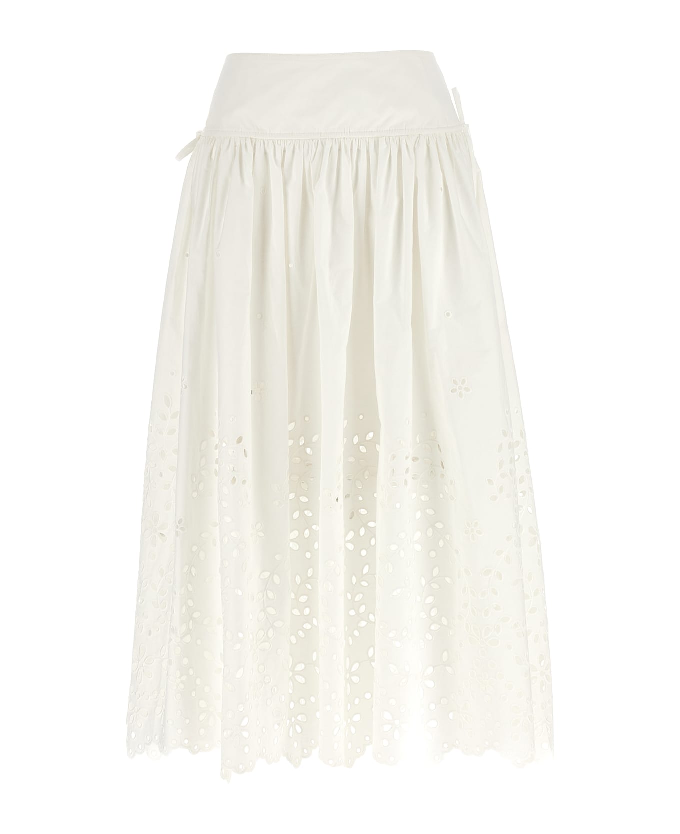 'White Cotton Embroidered Midi' cotton skirt embroidered with sangallo, high waist model with flared silhouette, back zip closure, drawstring at the waist, unlined, pockets.