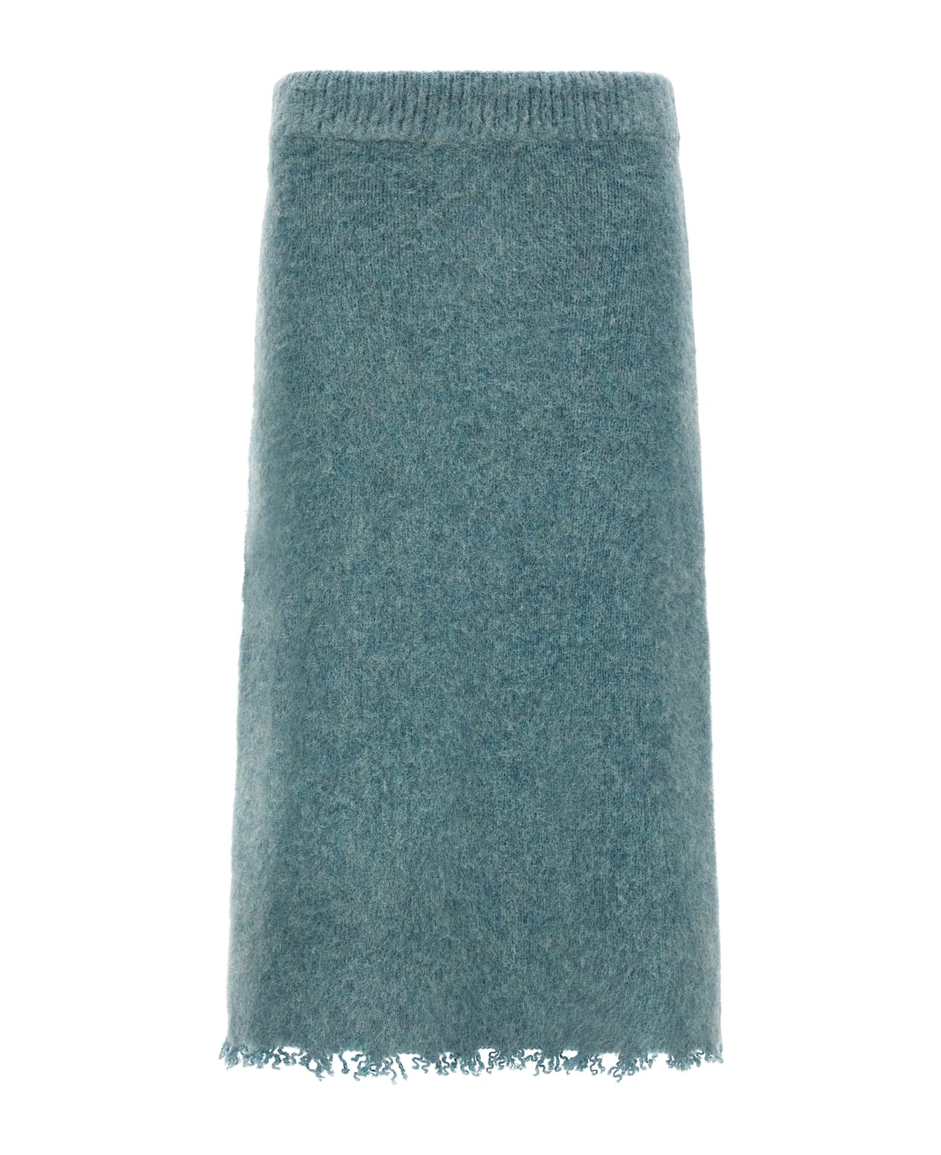 Midi skirt in brushed knit Shetland wool with slightly high elastic waistband, raw cut hem. Composition: 100% wool