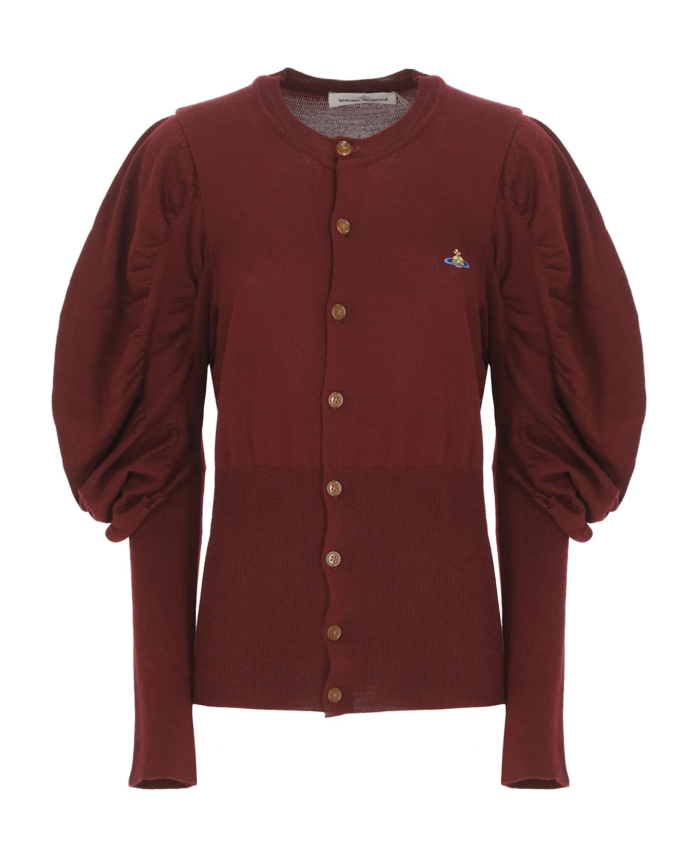 - Bordeaux Vivienne Westwood virgin wool cardigan for woman - Round neck - Long sleeves with drape - Front contrasting color embroidered logo - Front buttons fastening - Elastic ribbed trims Composition: 100% Virgin Wool