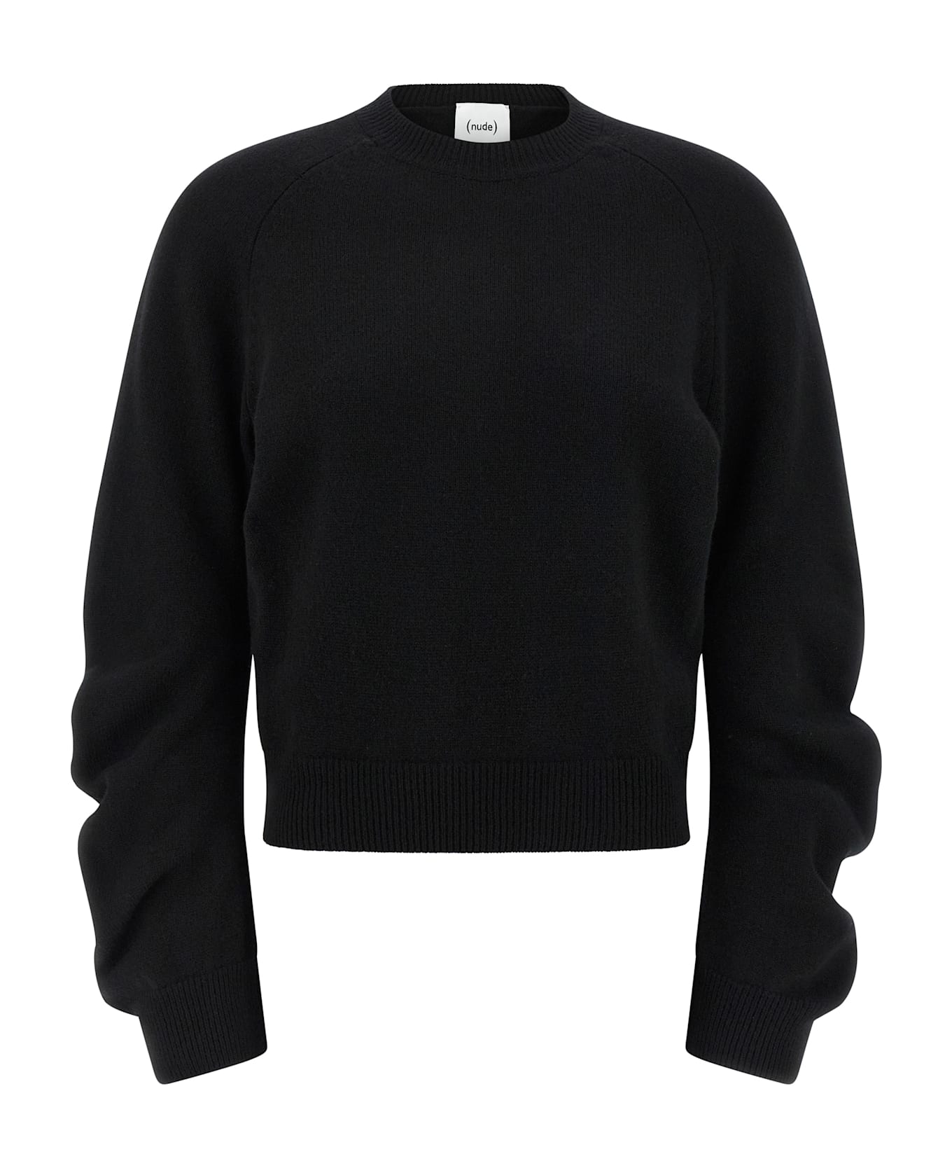 Virgin wool crewneck sweater with long cuffed sleeves and a curved silhouette.
