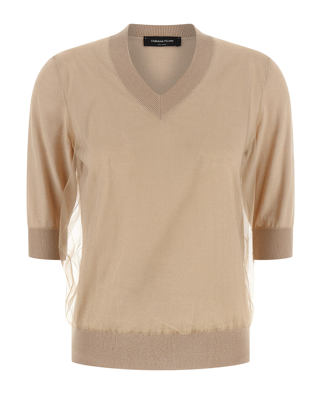 Virgin wool and cotton blend sweater with double layer tone-on-tone tulle insert, V-neck, short cuffed sleeves, and headband on the hem. Composition: 53% virgin wool, 47% cotton