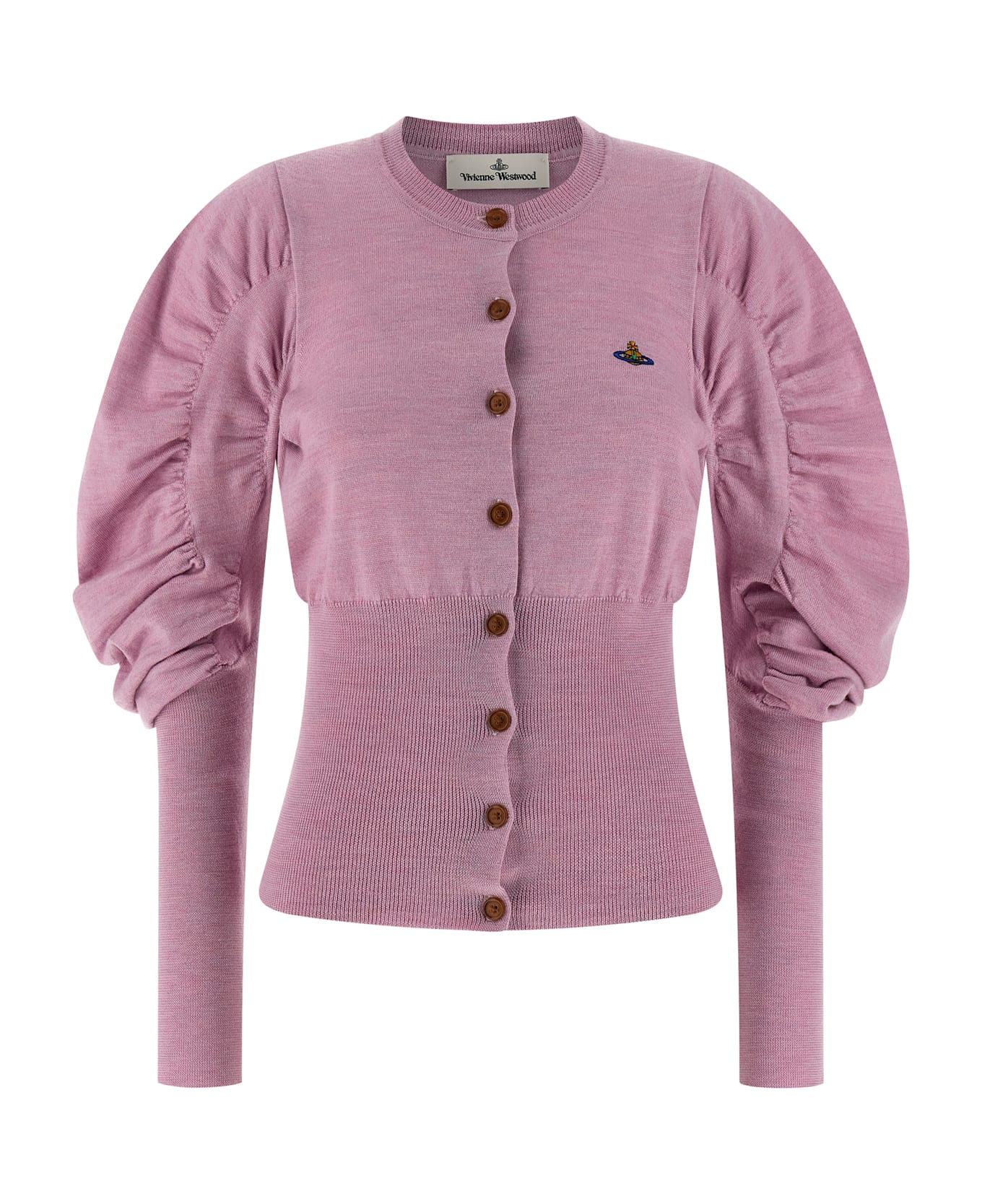 'Eli' mélange virgin wool cardigan with logo embroidery and front button closure, round neckline, draped shoulders, long sleeves. Composition: 100% virgin wool