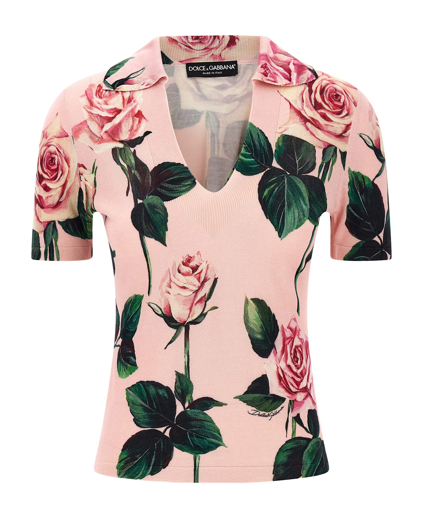 Stretch silk sweater with floral print, V-neck collar, and short sleeves. The differences in print placement you might find on this product is a characteristic of Dolce&Gabbana's Handmade products. A peculiarity that makes each garment or accessory unique and exclusive. Composition: 100% silk