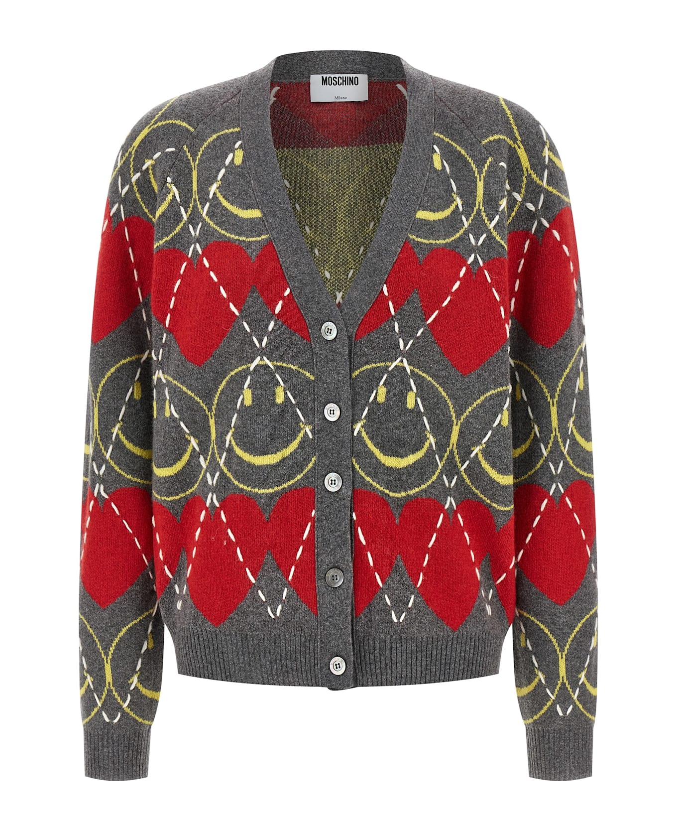 Wool blend cardigan with heart and 'Smiley®' inlays and diamond stitched pattern, V-neck, front button closure, long cuffed sleeves, and back leather logo patch.
