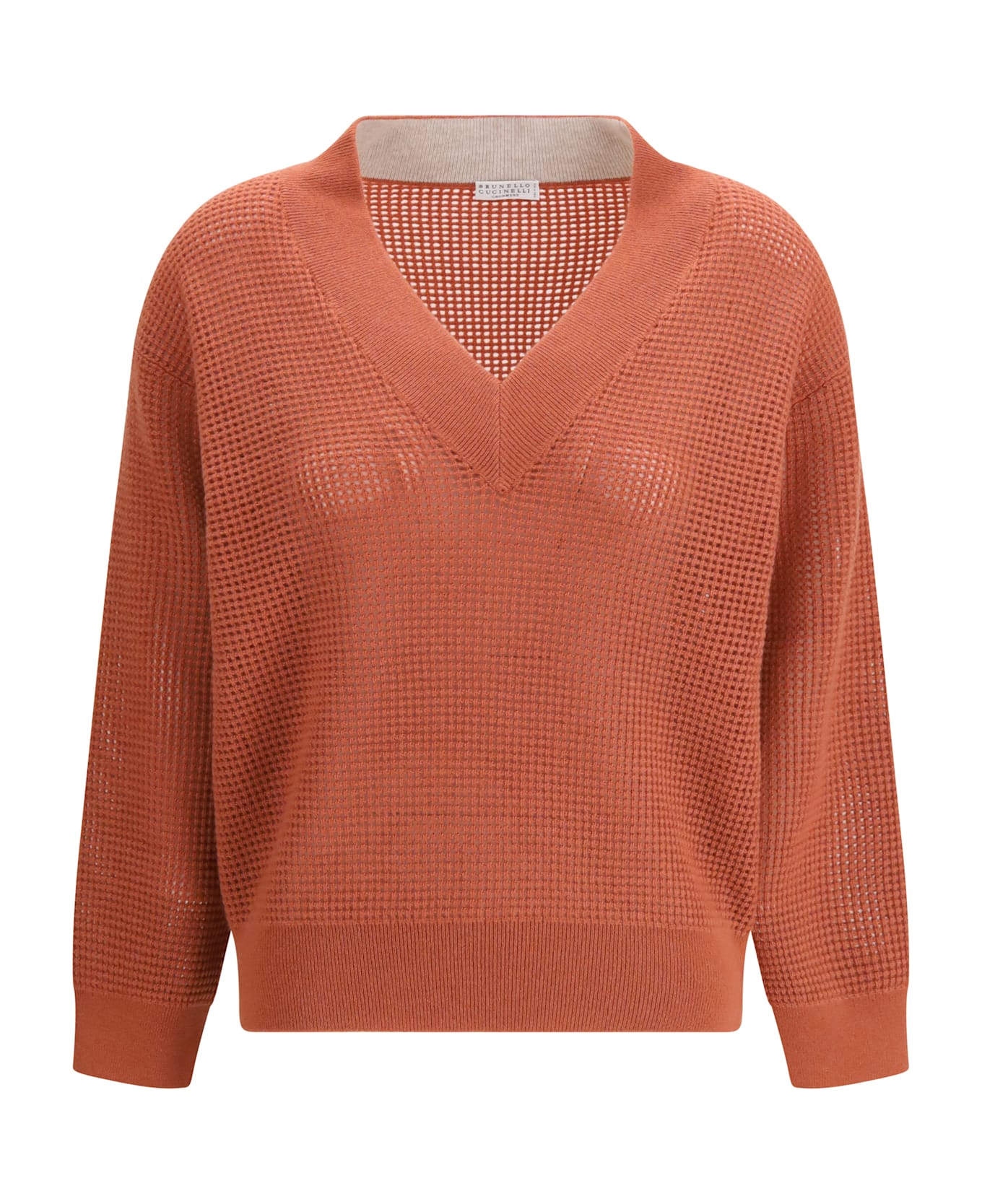 The cashmere net sweater by brunello cucinelli embodies a soft, luminous femininity, defined by the perfect balance of lightness, airiness, and a naturally enveloping feel. the fine cashmere yarn is crafted into an open net stitch, creating a refined interplay of texture, transparency, and movement. its relaxed silhouette is enhanced by dropped shoulders and wide sleeves, while the ribbed v-neckline adds a touch of understated elegance. finished with rib-knit cuffs and hem, this piece elevates knitwear to its most sophisticated and timeless expression.