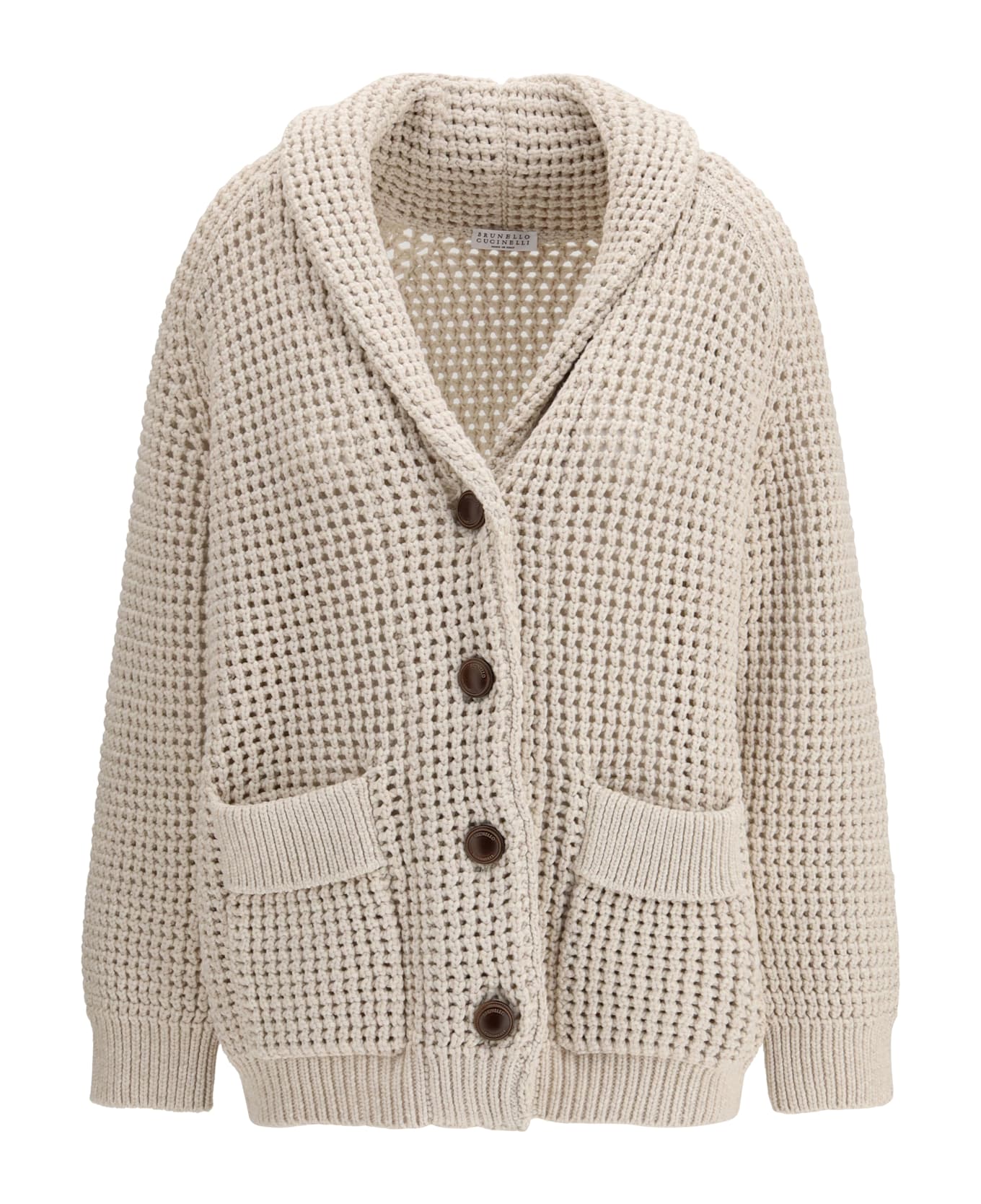 The cotton feather cardigan by brunello cucinelli blends timeless craftsmanship with refined materials in a piece designed to feel airy, soft, and effortlessly elegant. its net construction is reimagined for warm weather through a delicate interplay of openwork and solid textures, adding subtle dimension. a deconstructed silhouette and generous volume create a relaxed fit, enhanced by the shawl collar, ribbed trims, and patch pockets. a sophisticated, weightless layer that embodies the brand s understated luxury.