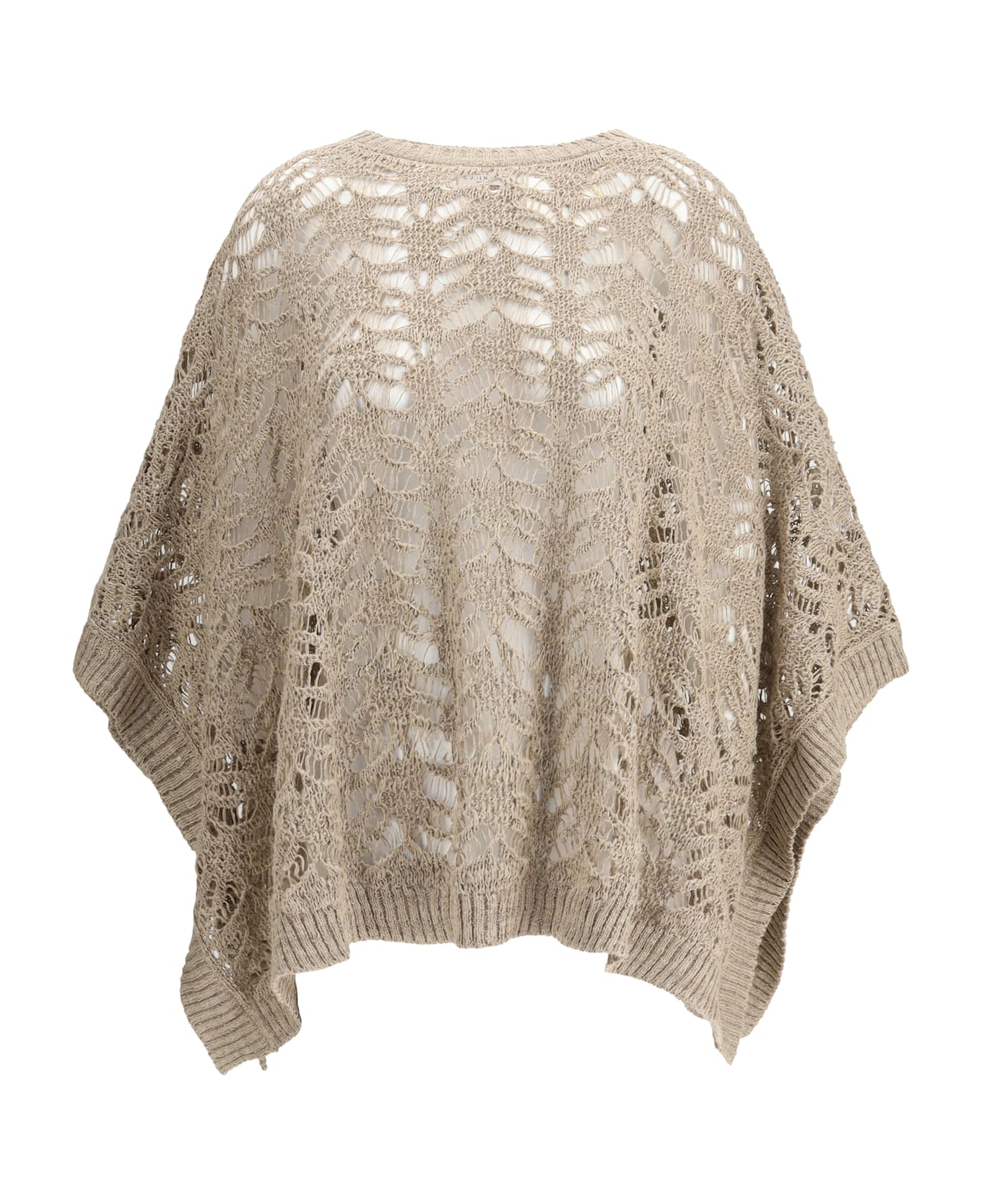 Brunello cucinelli's poncho is a refined and luminous garment that elegantly interprets artisanal style. made with a delicate crocheted openwork design, it features a ribbed crew neck and hem that lend structure and definition to the garment's flowing silhouette. the entire surface is embellished with small transparent all-over stitched sequins, which discreetly reflect light, giving a brilliant but never excessive effect. a sophisticated poncho, perfect for adding a touch of class and femininity to any look, both day and evening.