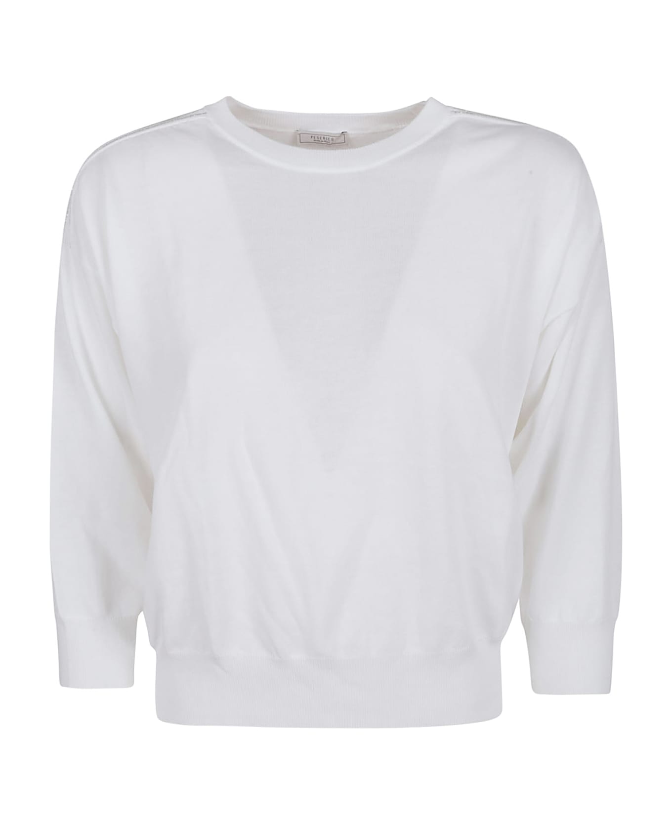 Pure cotton crepe yarn sweater from PESERICO. Crew neck; three-quarter sleeves; soft fit design. Characterized by satin workmanship with ribbed finishes, embellished with iconic Punto Luce on the shoulder.