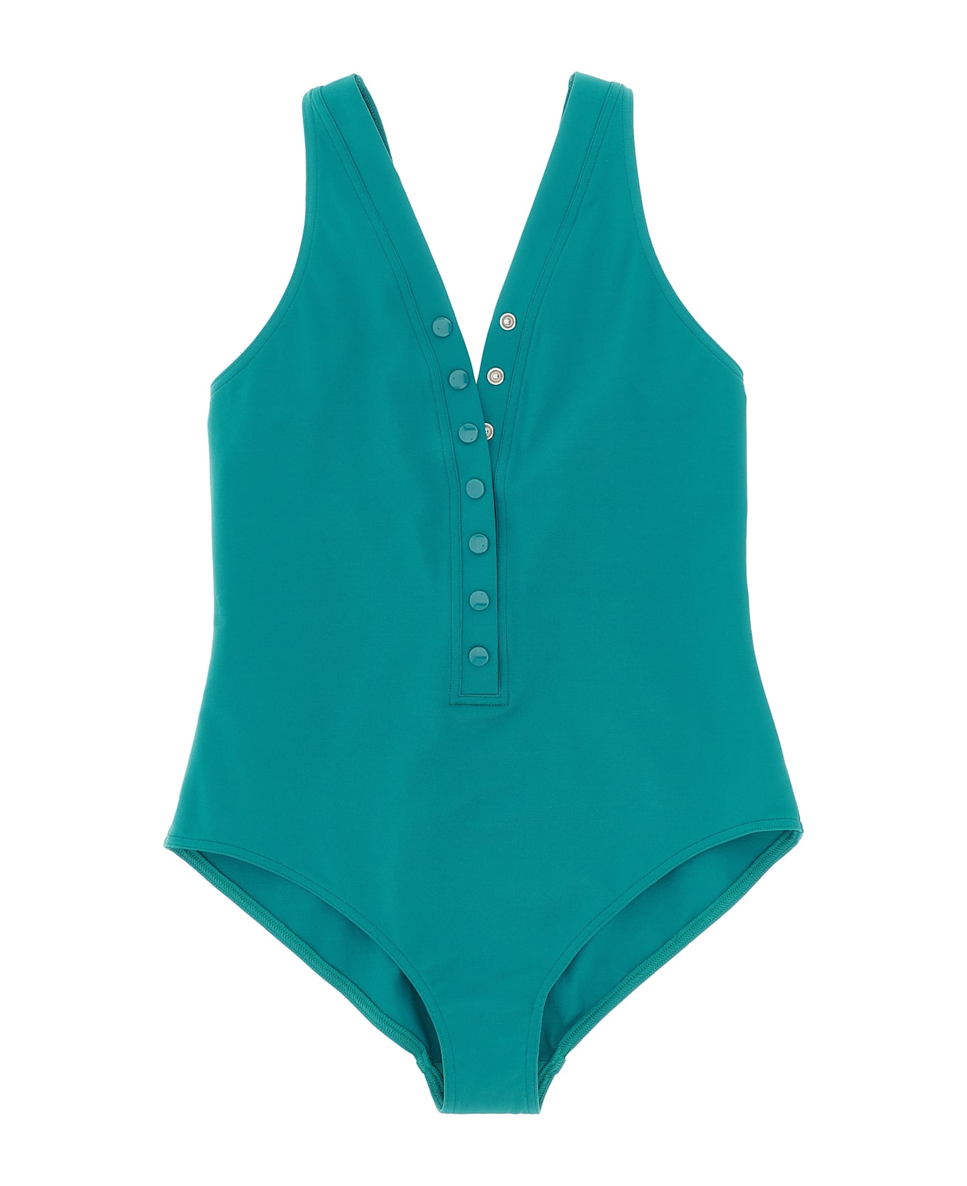 'Icône' one-piece swimsuit in Peau Douce* fabric with Olympic style with V-neck, front snap buttons, wide straps, wide round neckline.