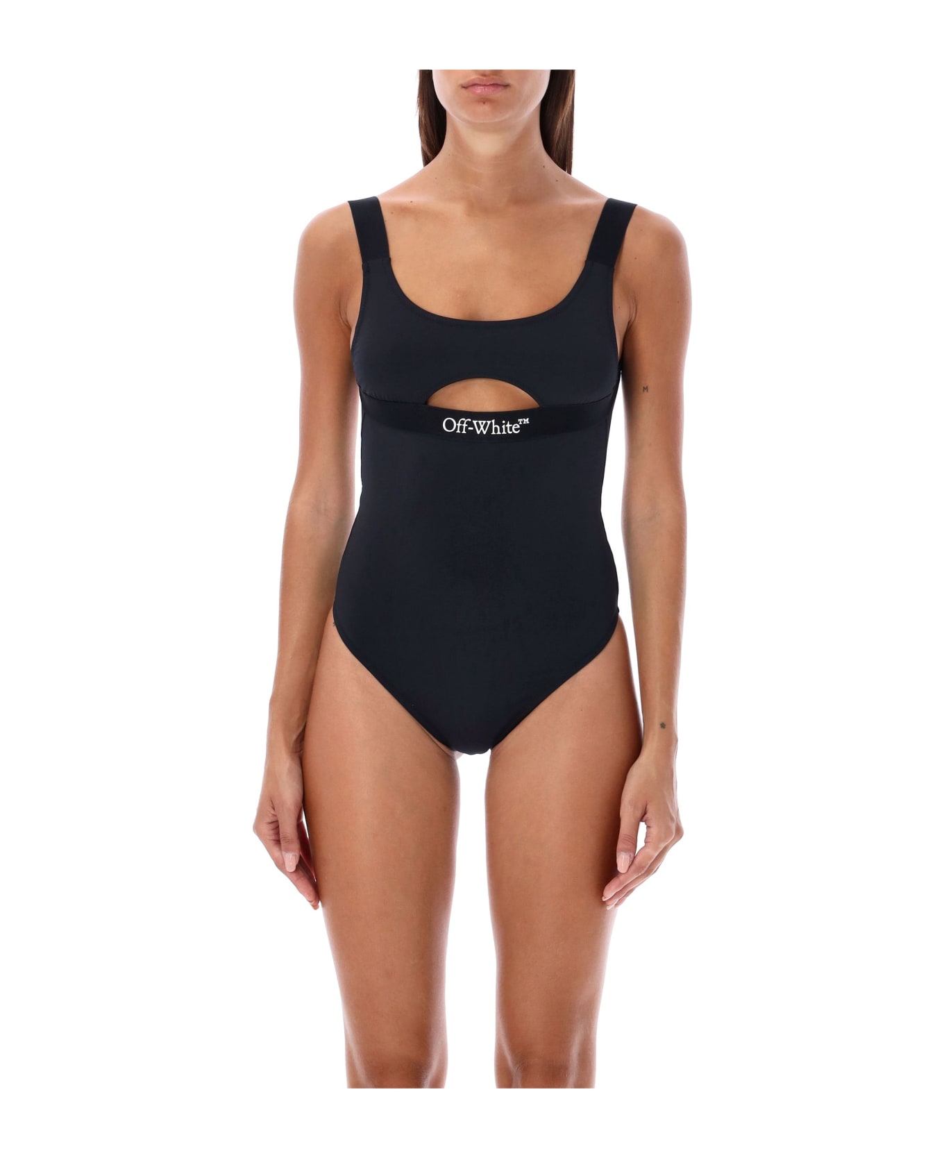 Logoband Swimsuit By Off-white. Featuring: Round Neckline Elastic Shoulder Straps Sleeveless Open Back Cut-out At Front Contrasting Logo At Front Stretch Slim Fit Model Is 1,72 M Tall And She Is Wearing Size 40