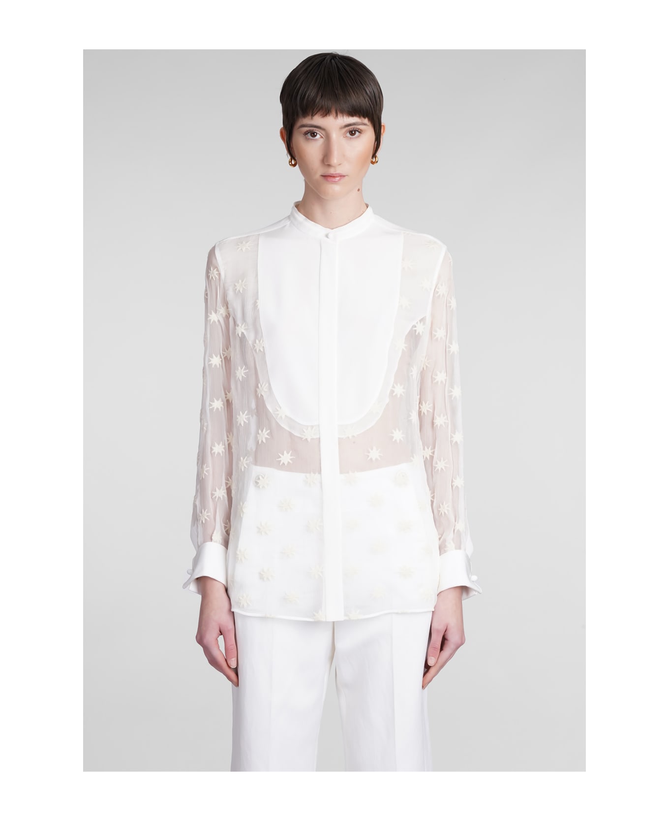 Shirt in white silk, mao collar, plastron detail, long sleeves, frontal buttoning, embroidered detail, 100% silk, Made in Slovakia, Model is 180 cm and wears 36