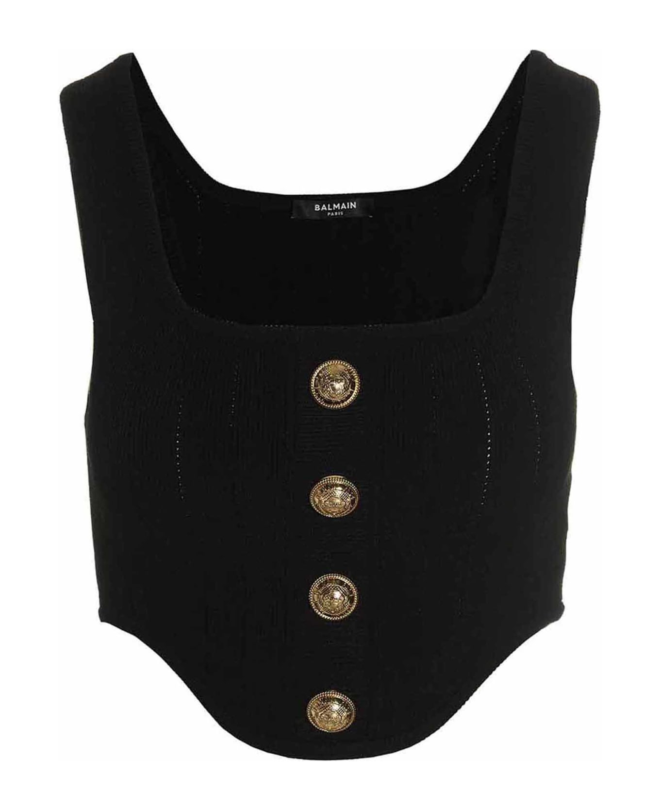 Ribbed knit top with front logo buttons, round neckline, shoulder straps and a cropped style. Composition: 83% viscose 17% polyester