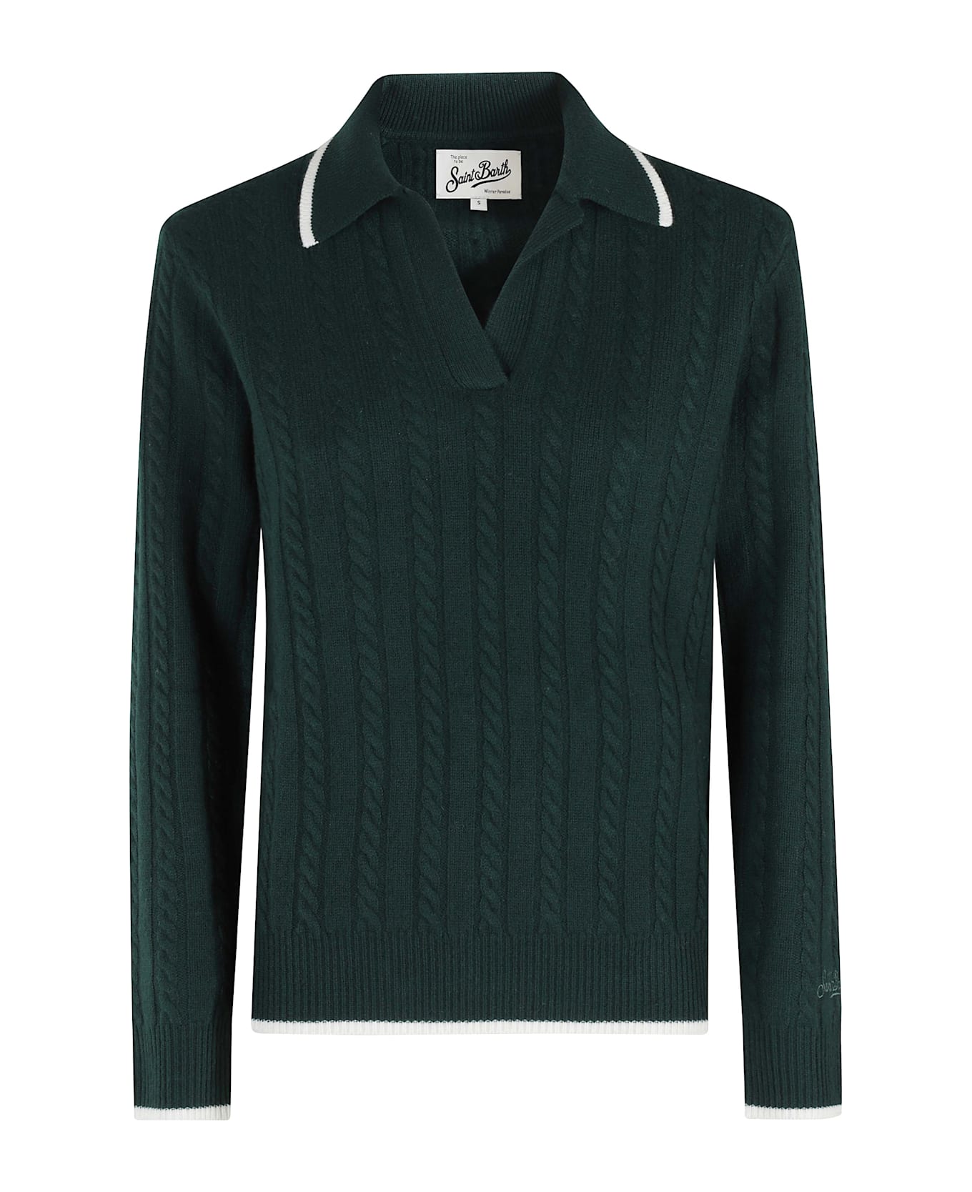 Sweater - Mc2 Saint Barth - Long sleeves braid polo shirt model - Green color - Collar - Long sleeves - Camel-colored fabric inserts on edges - Woven texture