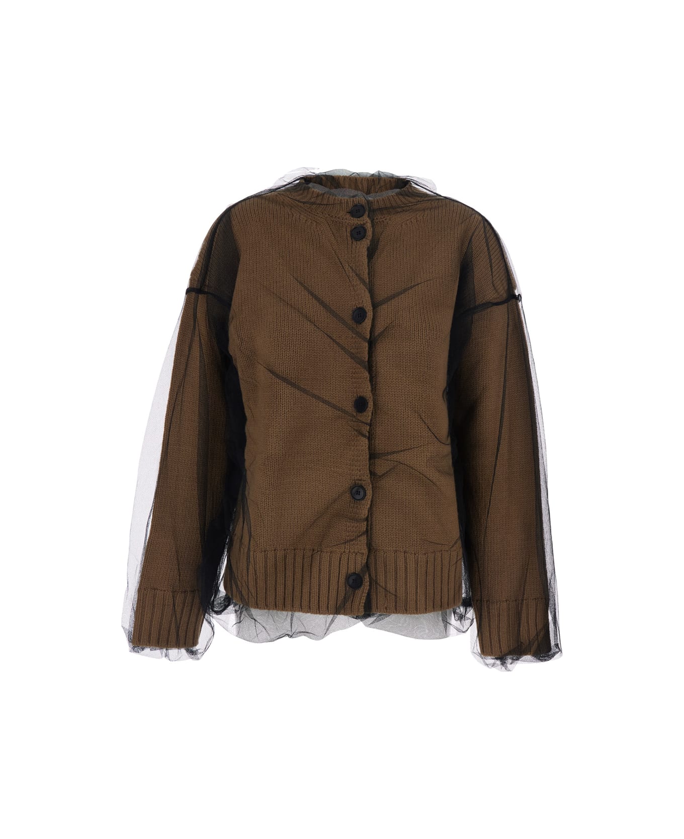 Brown Ribbed Crew Neck Sweater With Tulle Overlay In Wool Woman