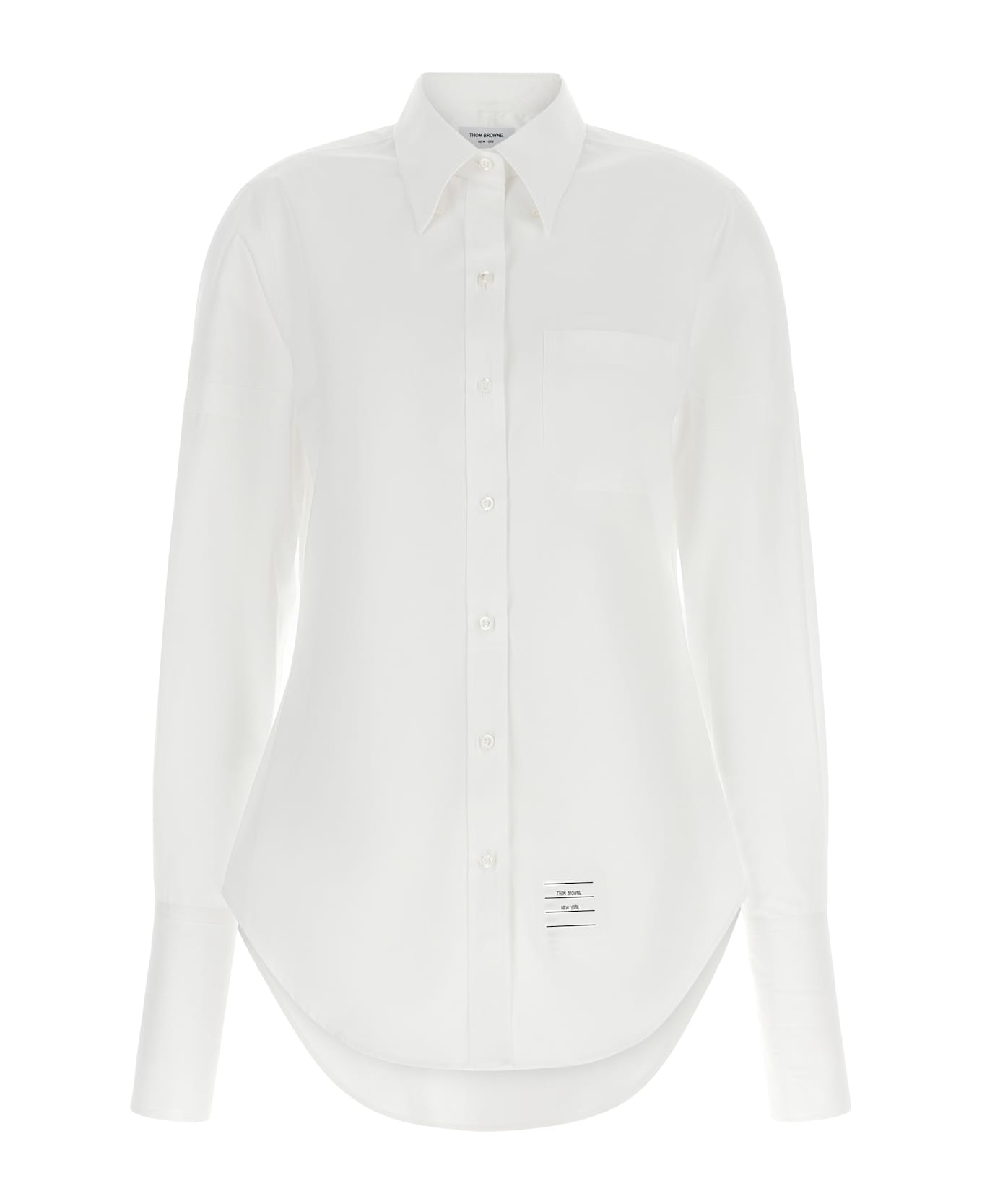 Cotton shirt, button-down model, pocket, logo patch and mother-of-pearl button closure on the front, long sleeves with maxi French cuffs and foldable sleeves, rounded hem. Composition: 100% cotton