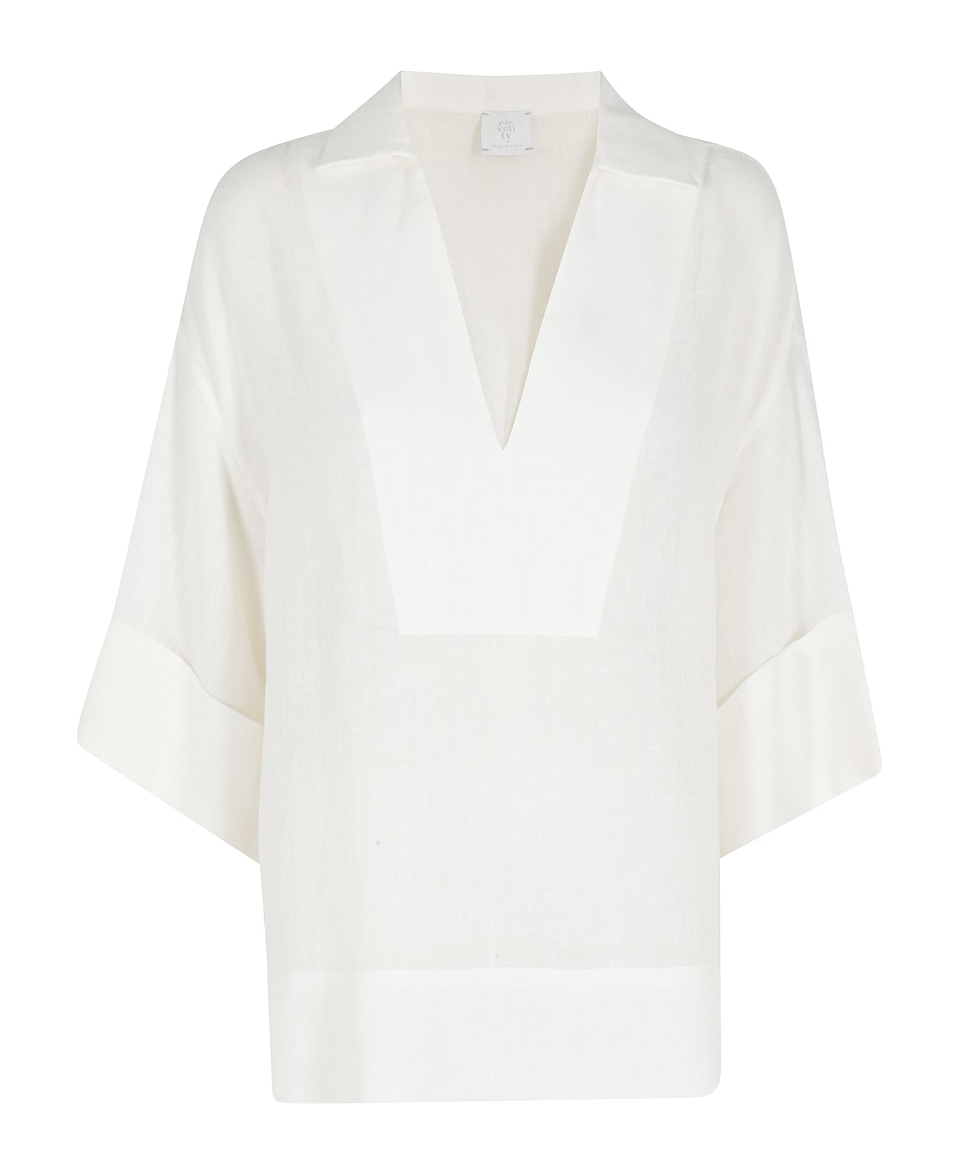 Category: Shirt Item: Over Shirt Brand: Eleventy Color: Ivory Neckline: Deep V-neck Details: Dropped shoulders, SIZE AND FIT Over fit Sleeve: Three-quarter length with lapels