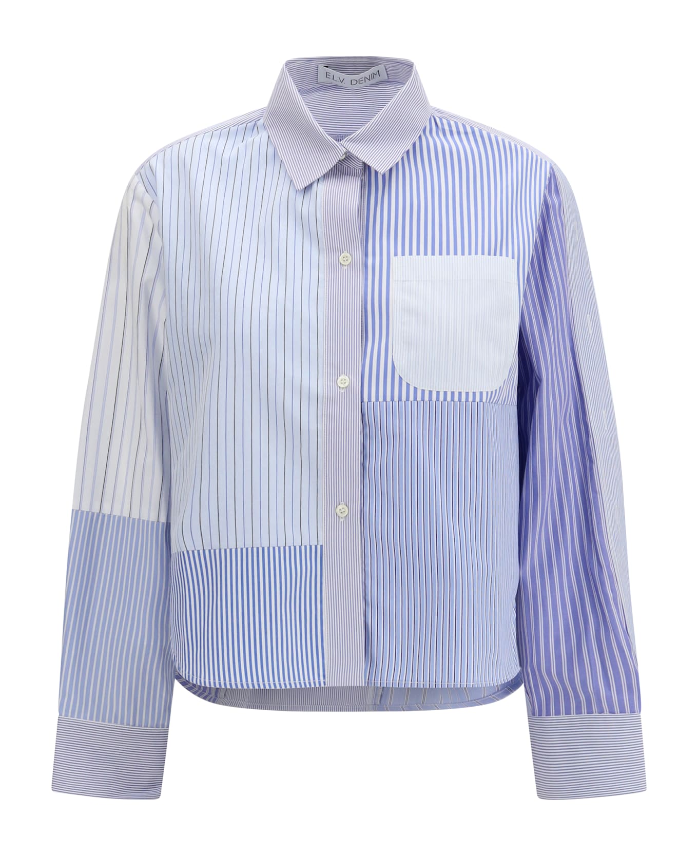 The emilie shirt by e. l. v. denim is a modern and versatile garment, featuring a paneled design with striped patterns that add a dynamic and sophisticated touch. the patch pocket on the front, classic collar, and button closure complete the design, while the boxy shape ensures a relaxed and comfortable fit. perfect for a casual yet stylish look, this shirt is ideal for those seeking a mix of comfort and originality in their wardrobe.