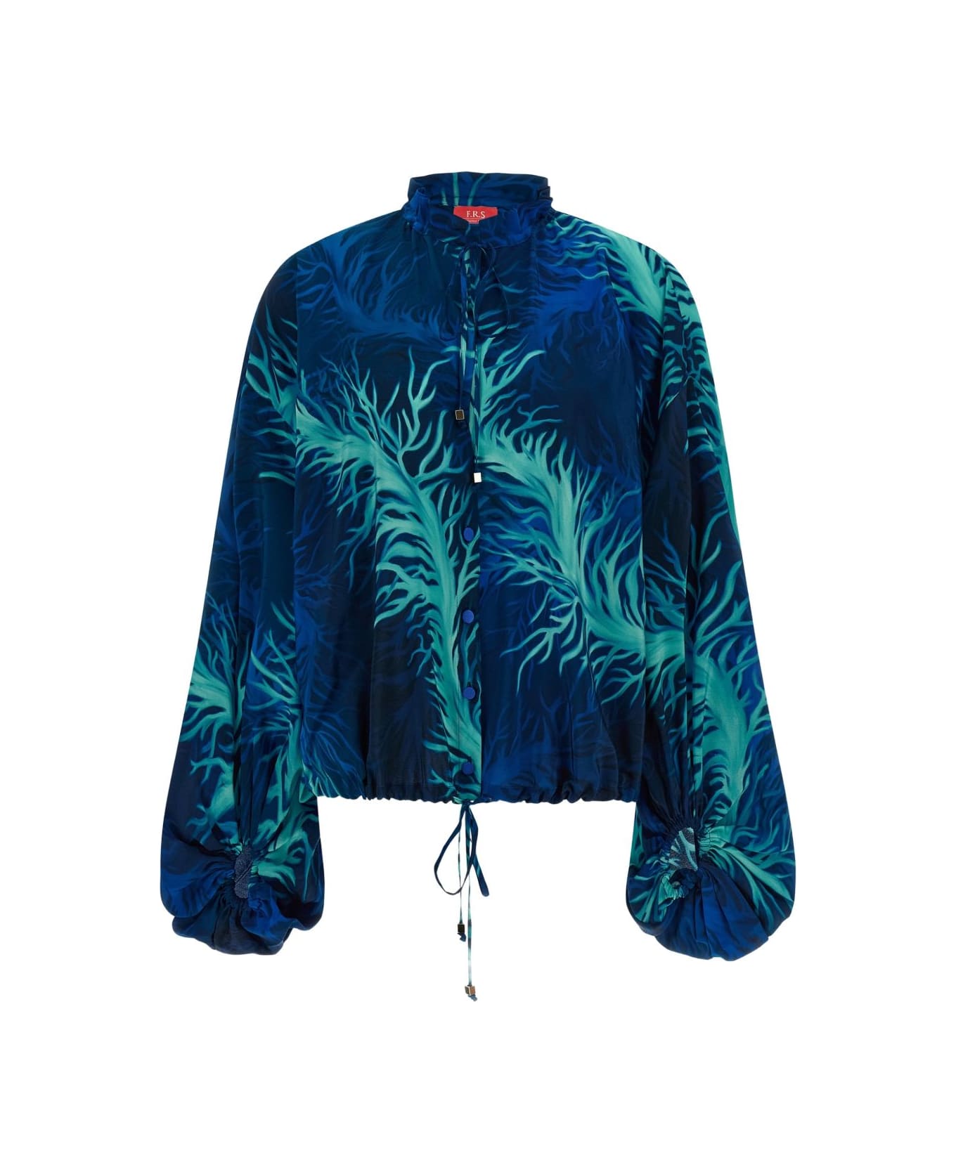 blue coral print ruffled collar adjustable neck front button closure elastic cuffs drawstring hem