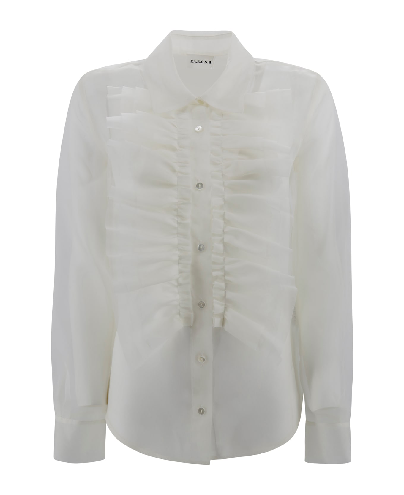 Transparent pure silk shirt with a romantic and refined jabot. The model features long sleeves with a classic cuff and a button closure, with a front button placket with small tone-on-tone buttons and a soft, slightly tailored line.