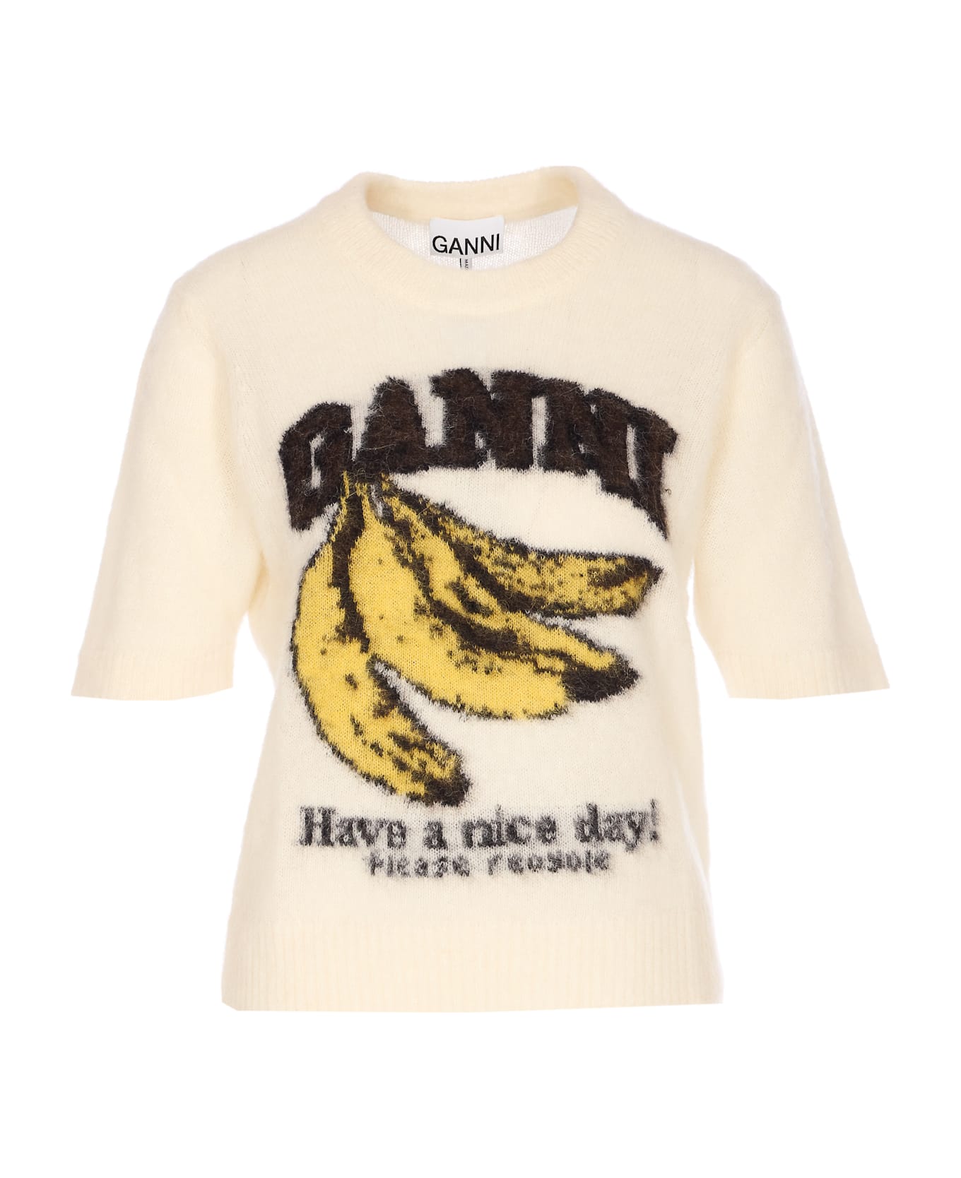 Ganni white brushed alpaca t-shirt, crewneck, logo and banana on the front Composition: 50% Alpaca Wool, 28% Polysmide, 22% Wool