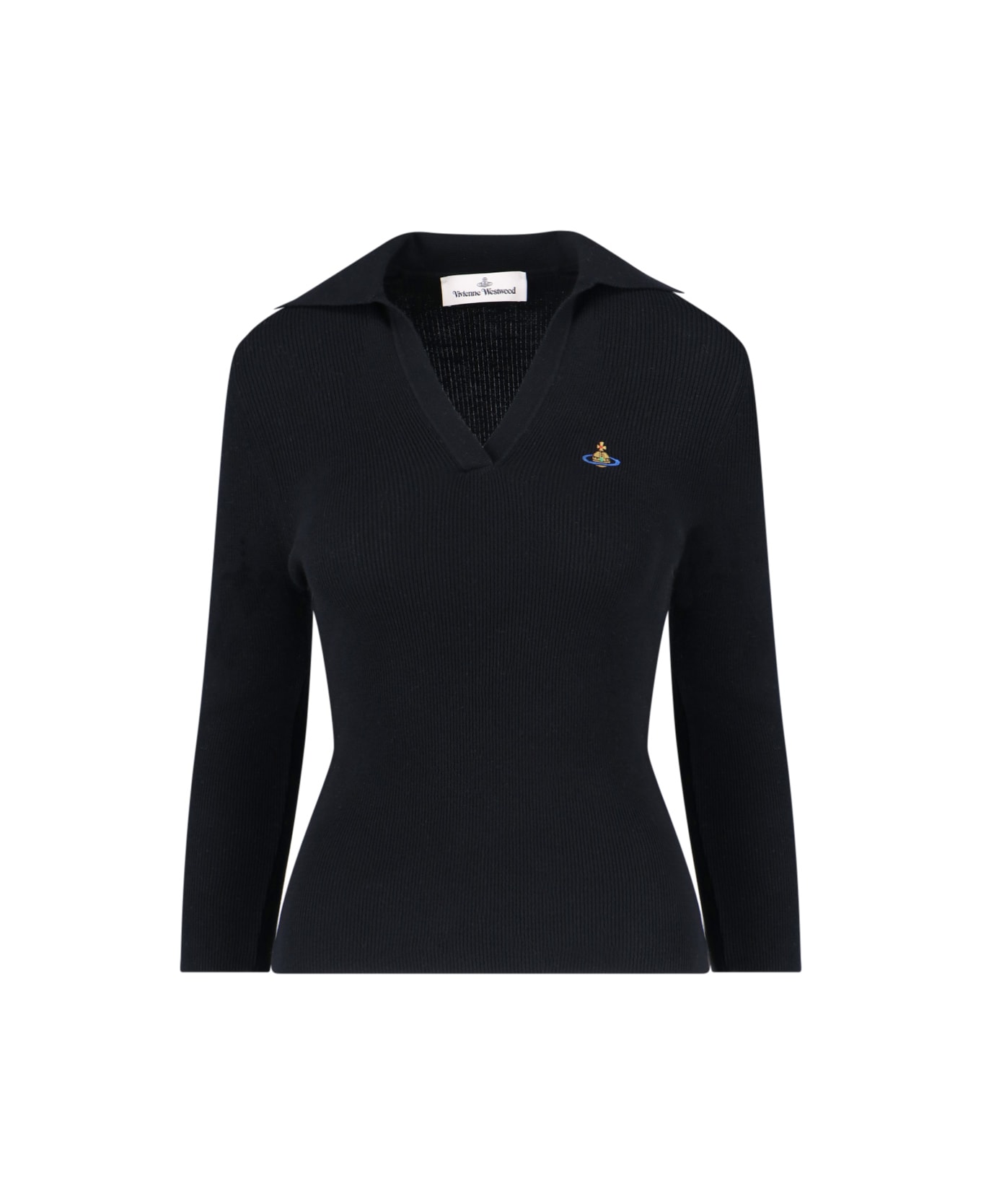 Vivienne Westwood 'Marina' polo shirt in ribbed black cotton and cashmere with V-neck, long sleeves, multicolor 'Orb' logo embroidery on the chest, straight hem. Composition: 85% Cotton, 15% Cashmere