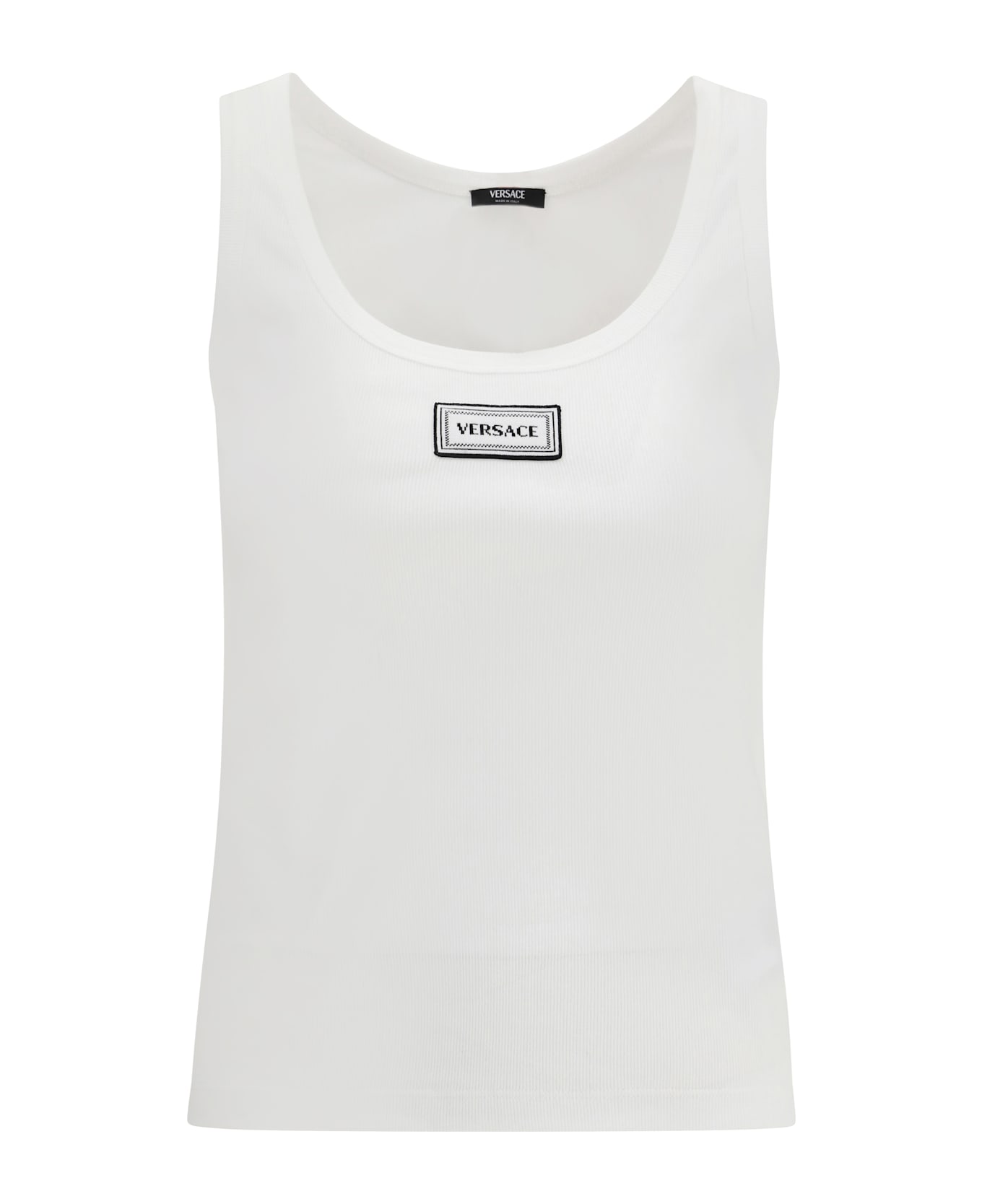 The tank top by versace is crafted from ribbed stretch cotton, offering a soft, flexible fit that contours to the body. the sleeveless design is completed with a clean scoop neckline, while the jacquard 90s vintage logo patch at the front adds a signature versace accent. a versatile and streamlined piece, perfect for everyday styling with a distinctive heritage touch.