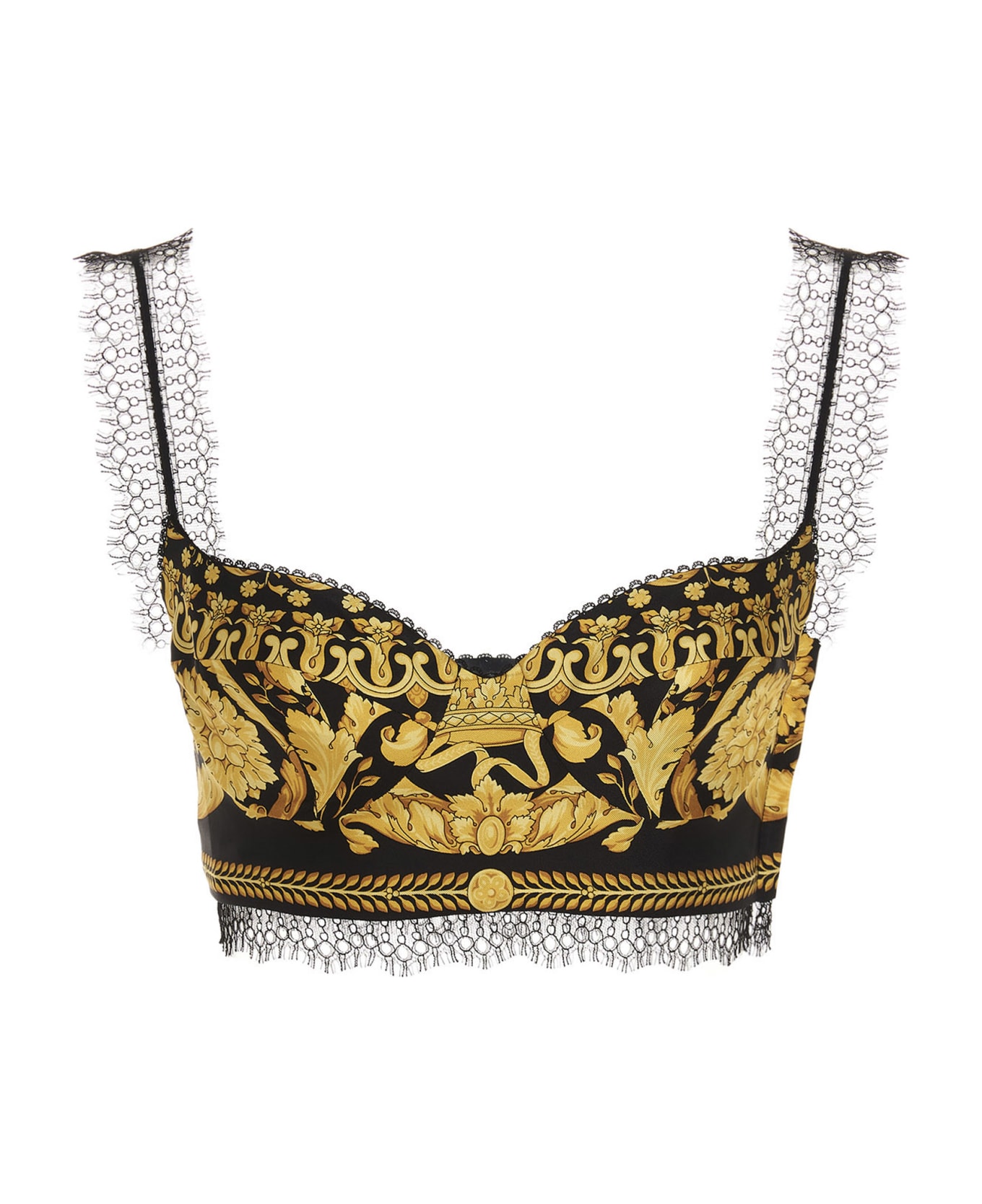 'Barocco Heritage' silk twill top with lace shoulder straps, a side zip closure, inner underwire and a cropped fit. Composition: 100% silk